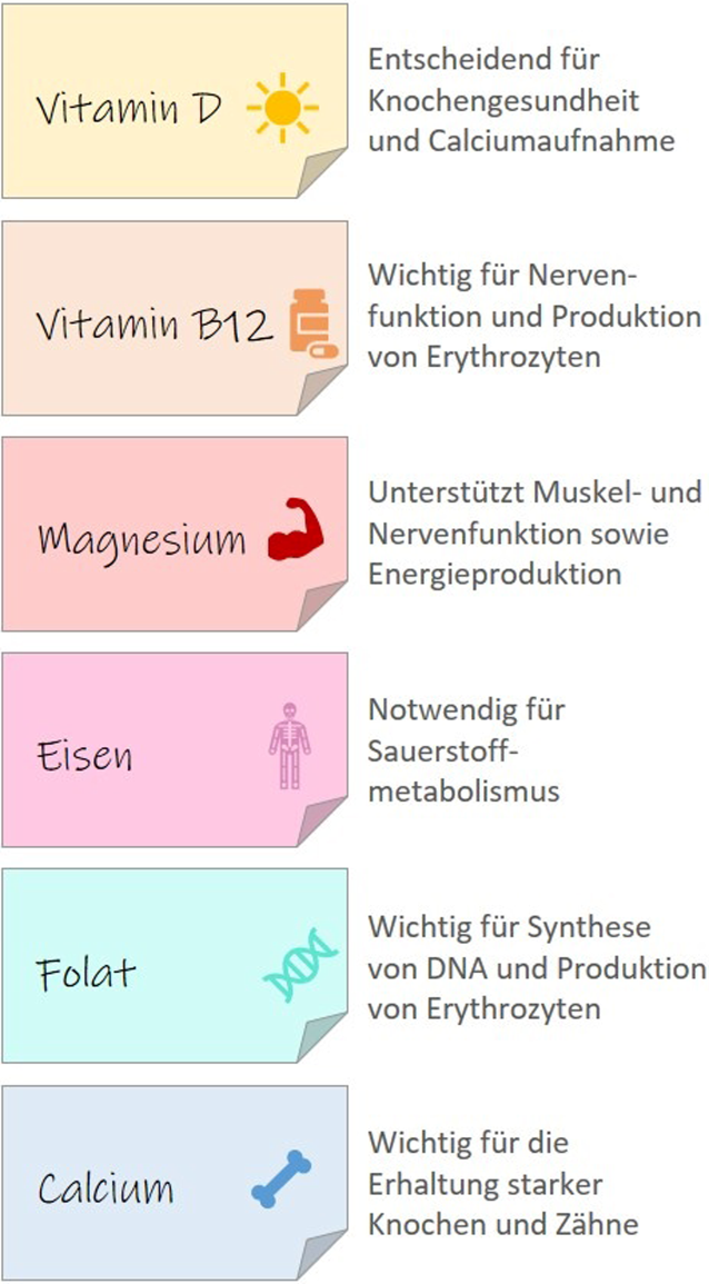 Um altersassoziierte Veränderungen hinauszuzögern und Krankheiten vorzubeugen, ist ein bewusster Lebensstil mit einer gesunden, ausgewogenen Ernährung wichtig. Eine unzureichende Zufuhr von Mikronährstoffen kann erhebliche negative Folgen für die Gesundheit haben [28]. Im Folgenden werden einige – in der Versorgung besonders kritische – Mikronährstoffe näher betrachtet (Abb. 2). Der Fokus liegt auf Vitamin D, Vitamin B12 und Magnesium. Eisen, Folat und Calcium werden ergänzend kurz behandelt, da sie – ähnlich wie auch in anderen Bevölkerungsgruppen – in der Versorgung kritisch sein können.