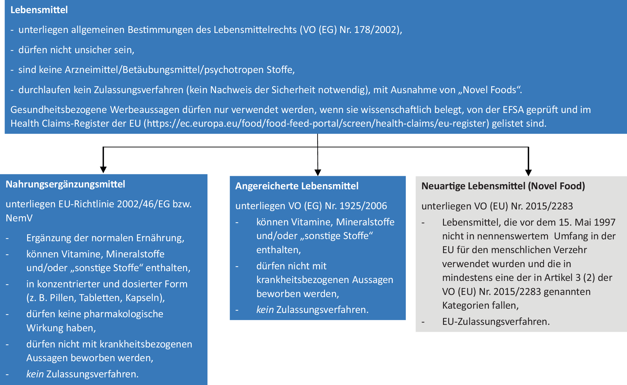 Nahrungsergänzungsmittel und angereicherte Lebensmittel sind in der EU als Lebensmittel definiert, nicht als Arzneimittel (siehe auch Beitrag von Schulze in diesem Themenheft). Gemäß Basisverordnung VO (EG) Nr. 178/2002 [10] sind beim Herstellen und Inverkehrbringen von Lebensmitteln bestimmte Anforderungen zu erfüllen (Abb. 1).