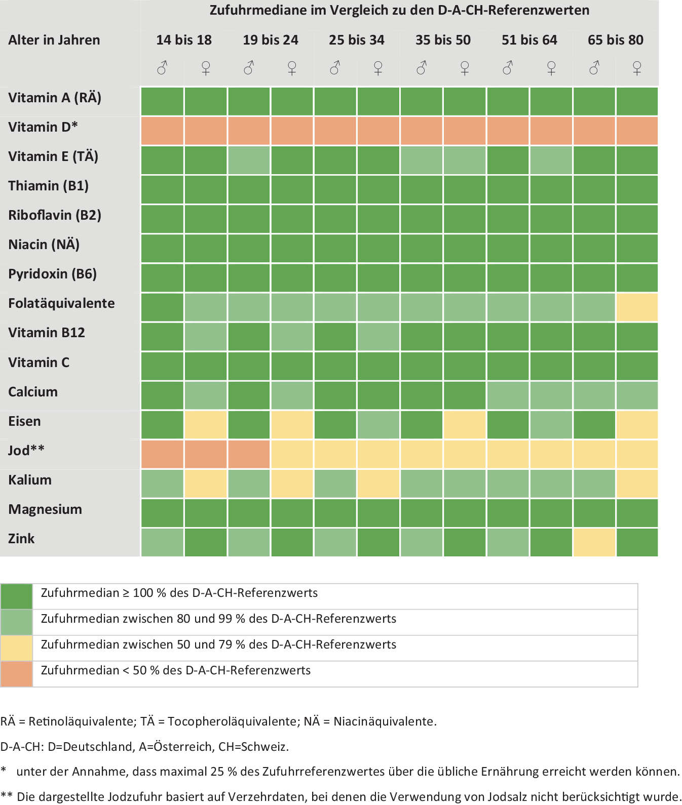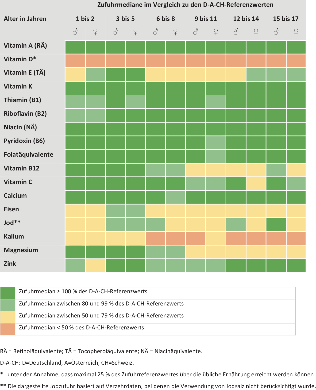 Die für Deutschland vorliegenden Daten aus der Nationalen Verzehrstudie (NVS) II (Erwachsene) sowie aus KiESEL1 (Kinder von 0,5 bis 5 Jahren) und EsKiMo2II (Kinder von 6 bis 17 Jahren) belegen, dass die Zufuhr von Vitaminen und Mineralstoffen im Allgemeinen ausreichend ist [25‐27]. Mikronährstoffe, bei denen die Zufuhrmediane der Erwachsenen unter den jeweiligen D‑A-CH-Referenzwerten (D = Deutschland, A = Österreich und CH = Schweiz) liegen, sind Vitamin D, Jod sowie teilweise Eisen (bei Frauen) und teilweise Kalium (Abb. 2; [25]). Bei Kindern und Jugendlichen sind es Vitamin D sowie teilweise Vitamin E, Vitamin B12, Eisen, Jod, Kalium und bei Kindern ab 9 Jahren Magnesium (Abb. 3; [26, 27]).
