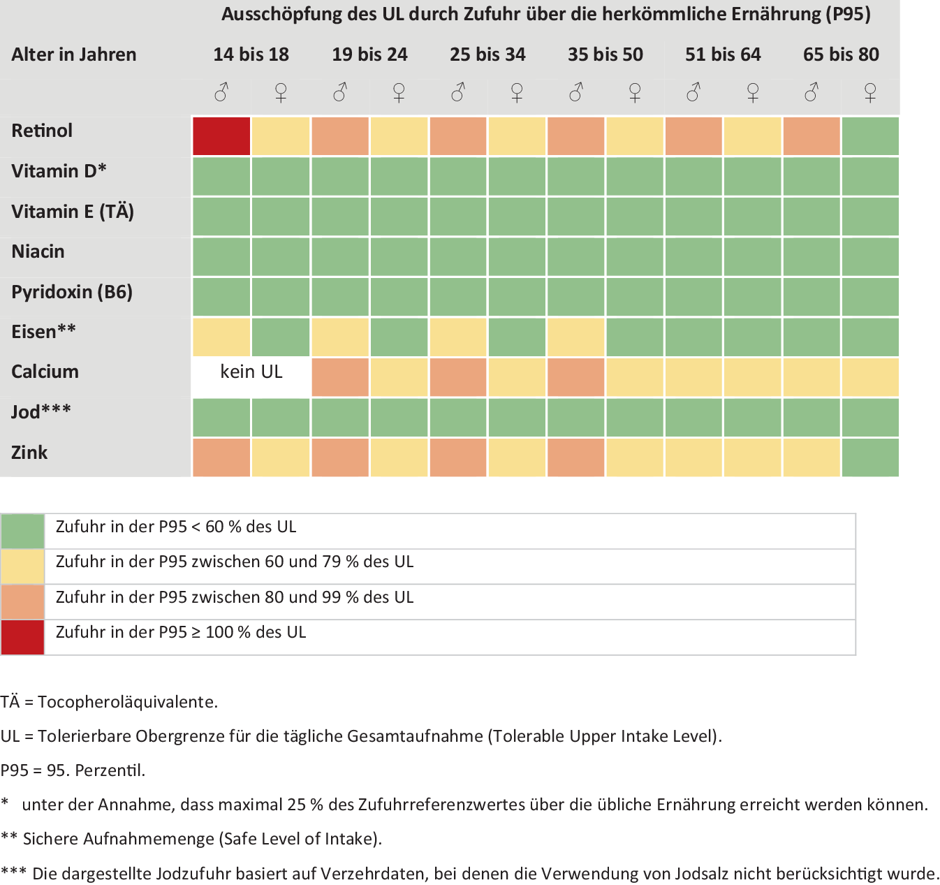 Der UL definiert die tägliche Zufuhrmenge eines Nährstoffs aus allen Quellen, die bei chronischer Zufuhr mit hoher Wahrscheinlichkeit nicht mit unerwünschten gesundheitlichen Wirkungen einhergeht.