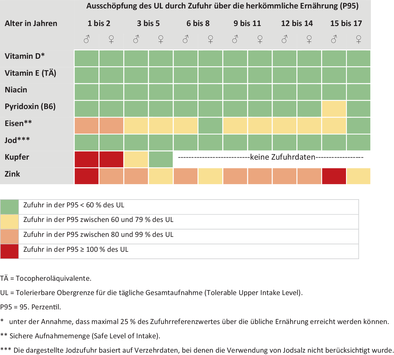 Risiko einer Überversorgung mit Vitaminen und Mineralstoffen bei Kindern und Jugendlichen bei herkömmlicher Ernährung, gemäß KiESEL (1- bis 5‑Jährige; [26]) und EsKiMo II (6- bis 17-Jährige; [27])