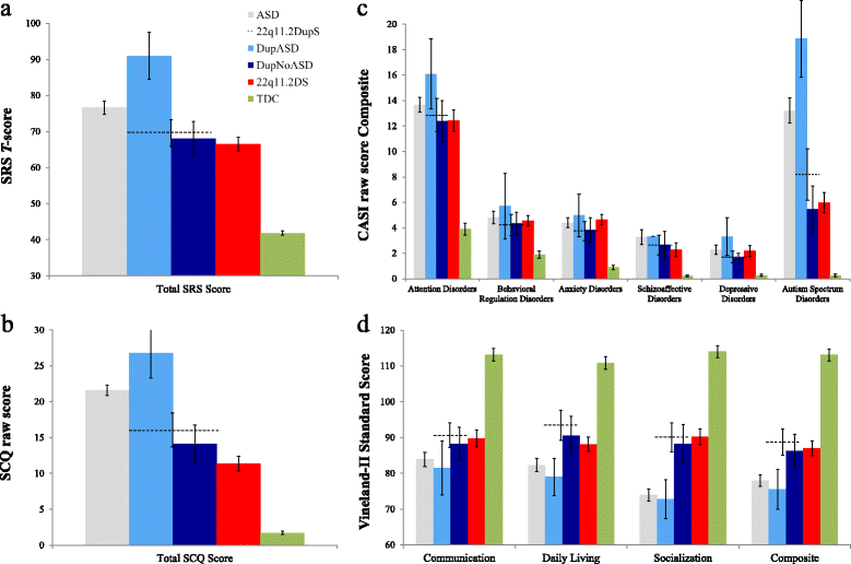 Questionnaire results for participants with 22q11.2DupS, 22q11.2DupS and comorbid ASD, idiopathic ASD, and typical development. Individuals with idiopathic ASD (gray), 22q11.2DS (red), and TDC (green) were compared to individuals with 22q11.2DupS (dashed line) on four parent-report questionnaires about behavioral symptoms. Error bars represent one standard error. The 22q11.2DupS group was further divided into individuals who have received a gold standard diagnosis of ASD (DupASD; light blue) and those who did not (DupNoASD; dark blue). On all measures, individuals with 22q11.2DupS showed scores similar to individuals with 22q11.2DS. However, when the 22q11.2DupS group was divided into subgroups, individuals in the DupASD subgroup showed scores similar to individuals with idiopathic ASD, whereas individuals in the DupNoASD subgroup showed mean scores in the average ranges, demonstrating less impairment than individuals with 22q11.2DS. Measures: a SRS and b CASI-4R: Scores reported in T-scores with mean 50 and SD 10. Scores below 60 considered in normal range. c SCQ: Raw scores reported. Scores above 15 are strongly suggestive of ASD. d Vineland-II: Scores reported in standard scores with mean 100 and SD 15. Scores above 90 considered in the average range. Abbreviations: ASD, autism spectrum disorder; CASI-4R, Child and Adolescent Symptom Inventory-4R; SCQ, Social Communication Questionnaire; SRS, Social Responsiveness Scale; TDC, typically developing children; Vineland-II, Vineland Adaptive Behavior Scales-II