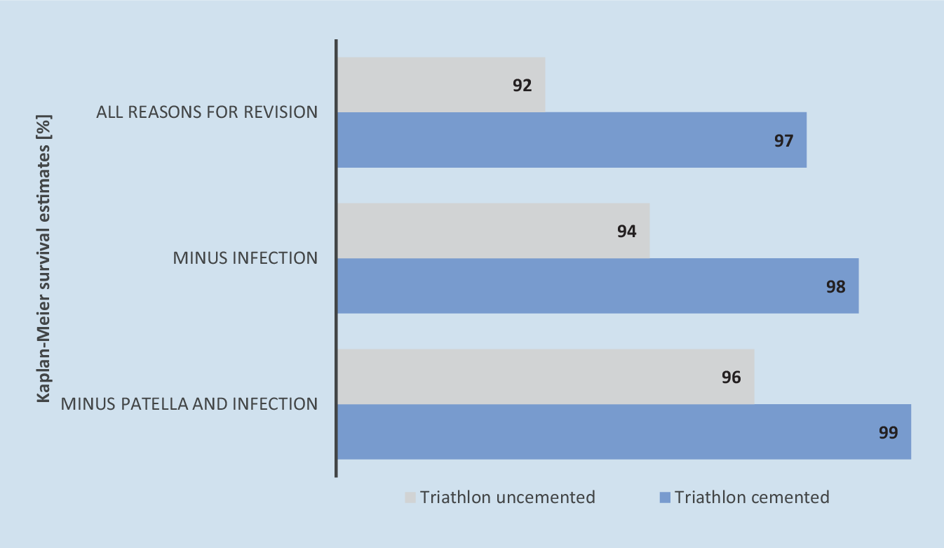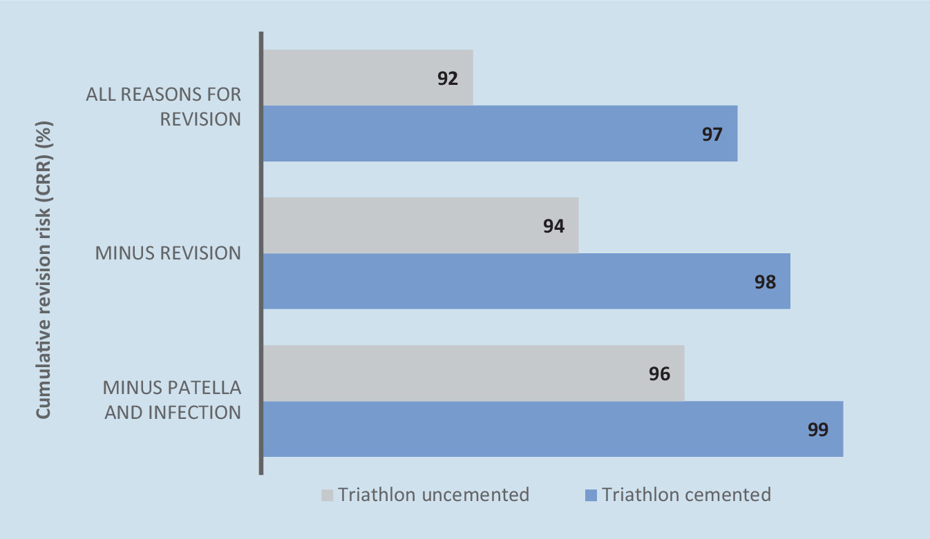 Cumulative revision risk (CRR) with a confidence interval (CI) of 95% for cemented and cementless Triathlon implants. SAR annual report 2022 [1]