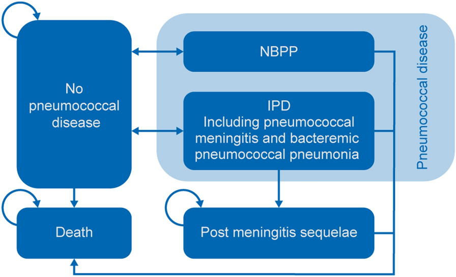 Markov model structure. IPD invasive pneumococcal disease, NBPP non-bacteremic pneumococcal pneumonia. Background mortality is applied to all health states in the model