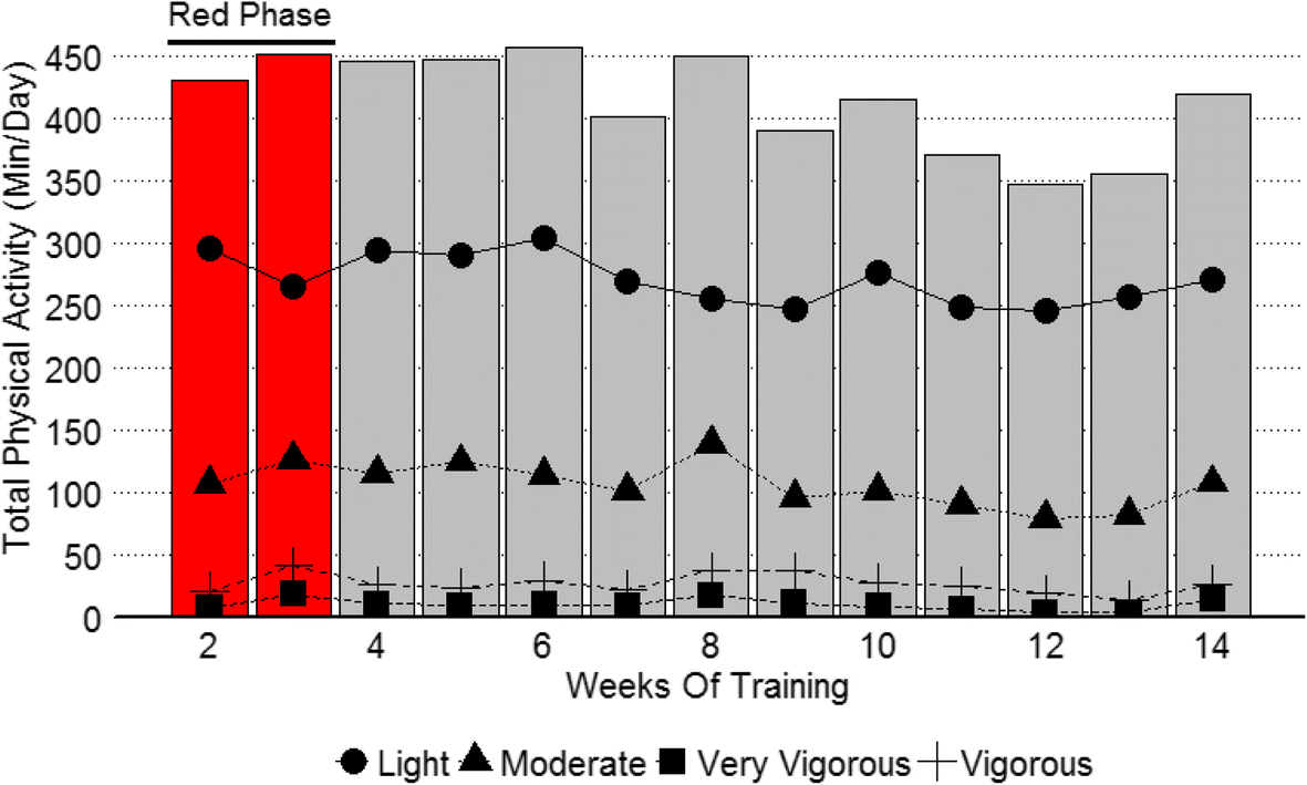 36]. A total of 840 data points were eliminated from the analysis due to wear times less than 600 min. All training data was averaged per day and week of training. The data is presented in average minutes per day.