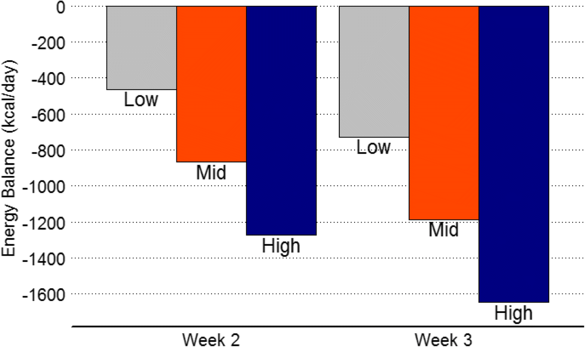 Given that this study was largely observational, food intake, physical activity and energy balance data were presented as mean ± standard deviation values, and no statistical testing was performed for these metrics. Dietary intake across meals was evaluated using repeated measures ANOVA. Paired samples t-tests were used to evaluate the simple main effect of time and independent samples t-tests to evaluate the simple main effect of group when significant group by time interactions were found. Normality of residuals was tested using the Shapiro-Wilks and Komolgorov-Smirnov test. Sphericity was evaluated using Maulchy’s test. During tests for normality of residuals for dietary intake one meal was determined to be a statistical outlier and was removed from the analysis because the participant’s calorie intake was approximately 3500 cal for one meal, which was 2.5 times greater than his next closest meal (1427 cal). Linear regression was used to determine if body weight was a significant predictor of negative energy balance. Body weight was mean centered (participants body weight – mean (body weight)) was used as the predictor for average energy balance during weeks two and three of IET. For probability testing, statistical significance was set at p < 0.05.