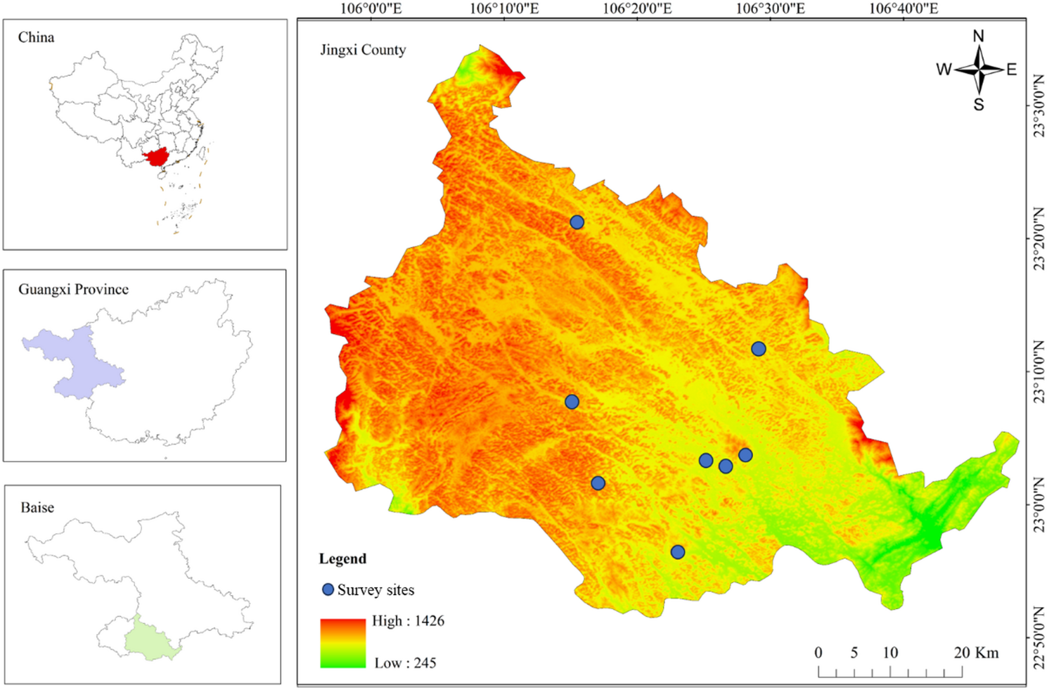 Jingxi County is located in the southwest of Guangxi Zhuang Autonomous Region, China, under the administration of Baise City, situated on the China-Vietnam border (east longitude 105°56′~106°48′, north latitude 22°51′~23°34′) (Fig. 1). As an important land route connecting China with Southeast Asia, the city hosts key border ports such as the Longbang Port. Its unique regional advantages make it a potential hub for regional biological exchanges (including the spread of invasive species) and the dissemination of cultural knowledge. Geographically, Jingxi is characterized by karst peak clusters, depressions, and peak forest valleys, making it a priority area for biodiversity conservation in China and a global hotspot for karst biodiversity in the Northern Tropics [27, 28]. The climate is classified as South Asian tropical monsoon, with an average annual temperature of 19.1 °C, featuring no extreme summer heat or winter cold, and significant daily temperature fluctuations.