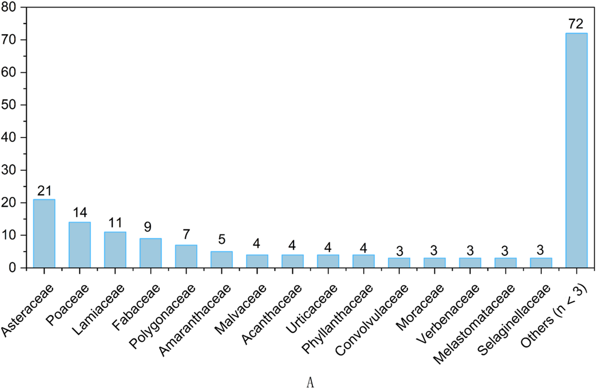 From the perspective of family and genus composition, the largest family is Asteraceae, with 21 species recorded (13.6% of the total species), including representative species such as Bidens pilosa L. and Prunella vulgaris L.; followed by Poaceae, with 14 species (9.1%), including Eleusine indica (L.) Gaertn. and Imperata cylindrica (L.) Beauv.; the third-largest family is Lamiaceae, with 11 species (7.1%), represented by species such as Ajuga ciliata Bunge (Fig. 3). In addition to these three families, the Fabaceae family has 9 species, Polygonaceae has 7 species, Amaranthaceae has 5 species, and Malvaceae, Acanthaceae, Urticaceae, and Phyllanthaceae each have 4 species. Convolvulaceae, Moraceae, Verbenaceae, Melastomataceae, and Selaginellaceae each have 3 species. The remaining 46 families have fewer than 3 species each, accounting for 46.8% of the total number of families. This distribution characteristic reflects the coexistence of concentration and diversity in the family and genus composition of medicinal weeds in the Jingxi paddy fields.