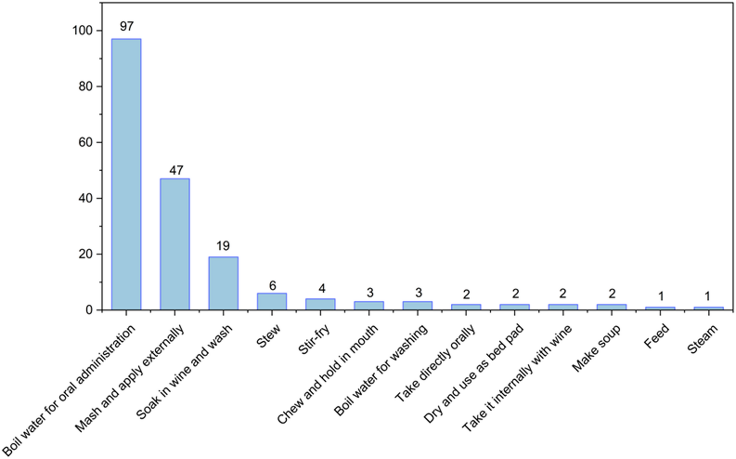 A systematic comparison with the Chinese Pharmacopoeia (1977 edition and 2020 edition) showed the following results: Among the 154 medicinal weeds, 128 species (accounting for 83.1%) were not included, including invasive species such as Bidens pilosa and Ageratum houstonianum. Among the 26 species recorded in the Pharmacopoeia, 19 species (accounting for 73.1%) have traditional uses that differ from those described in the Pharmacopoeia. For example, Prunella vulgaris in the Pharmacopoeia is listed for clearing liver heat and improving vision, while locally it is traditionally used for activating blood circulation and stopping bleeding; Ajuga ciliata is recorded in the Pharmacopoeia for clearing heat and detoxifying, cooling the blood, and reducing swelling, but locally it is mainly used for relieving itching (Table 5).