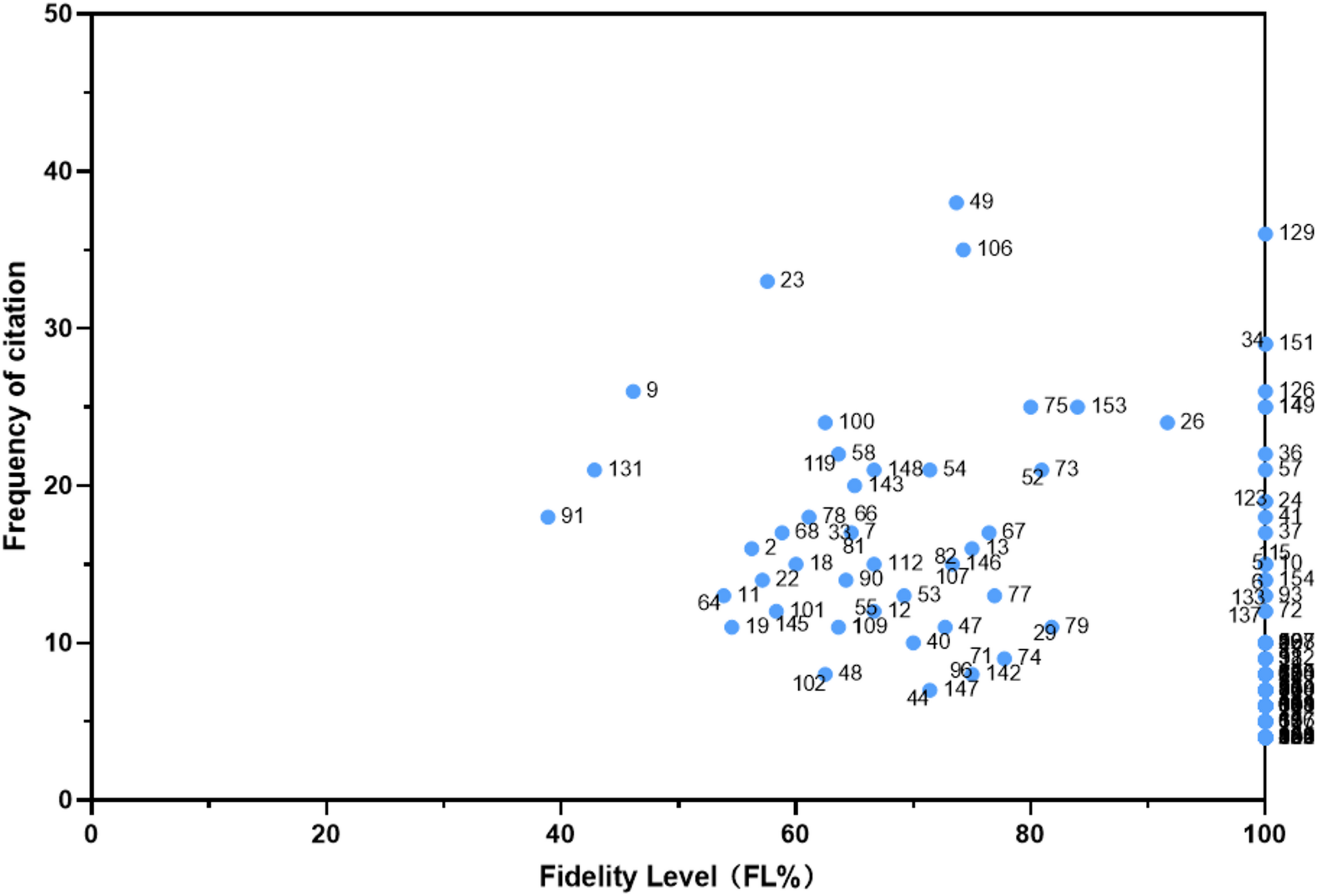 The relationship between Frequency of citation (FC) and Fidelity Level (FL%)