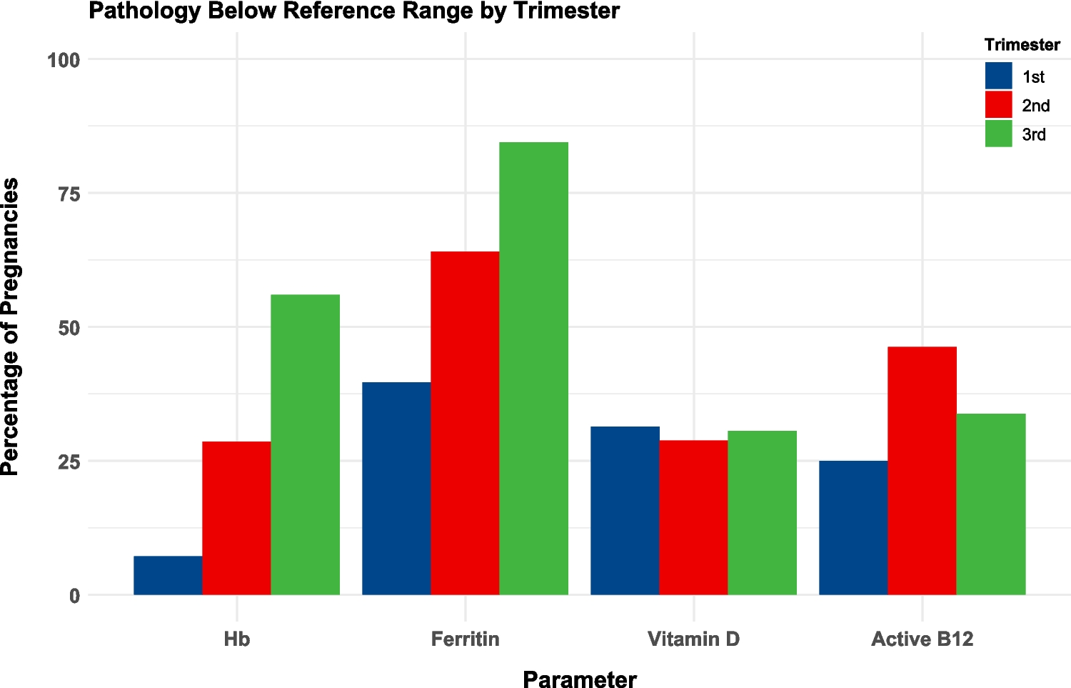 As part of standard care [18], clinical pathology parameters (including haemoglobin, ferritin, vitamin D and active B12) were measured at various time points throughout each woman’s pregnancy. Subnormal values were considered clinically significant and requiring intervention, compared to normal or elevated values, which indicate an absence of deficiency with or without the use of supplementation. Pathology tests were first grouped according to the trimester in which they were performed; each result was then categorised as ‘low’ if they fell below the laboratory-specific reference range to account for variations across different laboratories and assays. A woman was classified as having a ‘below reference range result’ for a trimester if at least one test result was low.