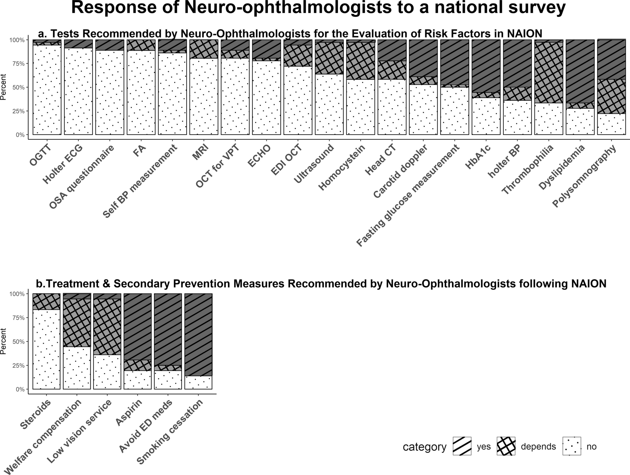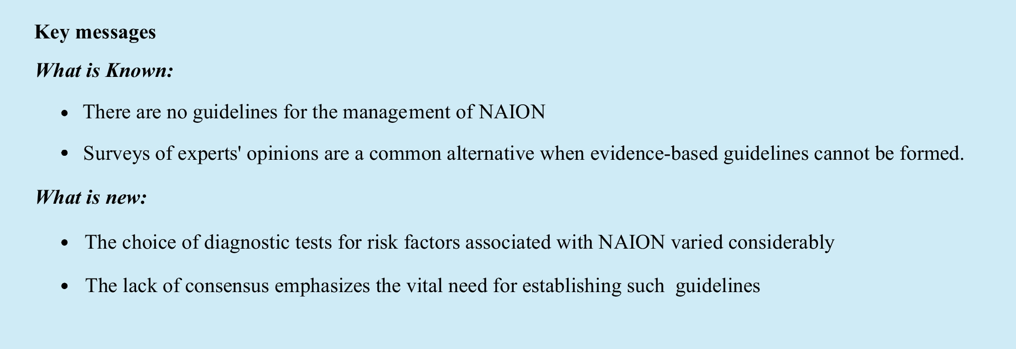 The conclusions drawn from this study are twofold. Firstly, the majority (~ 80%) of neuro-ophthalmologists find it significant to actively rule out DM, HTN, OSA, and dyslipidemia in NAION cases and avoid any treatment other than secondary prevention with aspirin. In forthcoming practice, neuro ophthalmologists may increasingly adhere to the continued use of aspirin following "the majority rule".