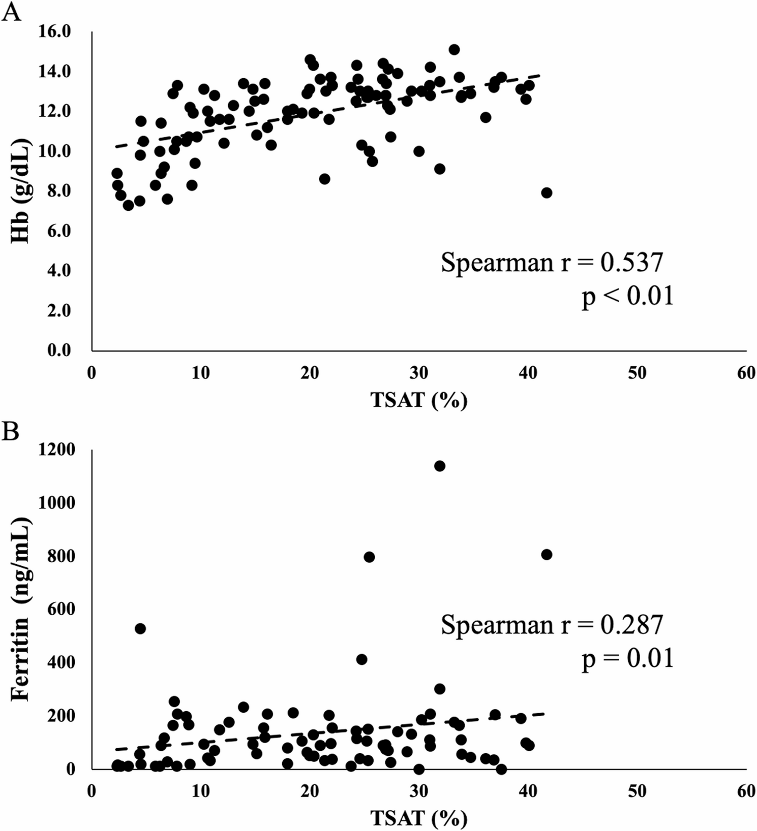 A total of 103 patients were assessed for eligibility. The median (interquartile range) hemoglobin level was 12.5 (10.6–13.2) g/dL, and 29.1% of patients had hemoglobin ≤ 11.0 g/dL before cancer treatment. TSAT < 20% and < 50% accounted for 46.7% and 99.0% of patients, respectively; 9.9% and 11.1% were classified as having absolute and functional iron deficiency anemia, respectively. Sixty-two patients received chemotherapy or concurrent chemoradiotherapy for their cancers, and 90.3% developed anemia within 6 months of initiation of treatment. Lower hemoglobin and serum ferritin before treatment, as well as hemoglobin at its lowest point within 6 months of treatment, were found in patients with TSAT < 20%.