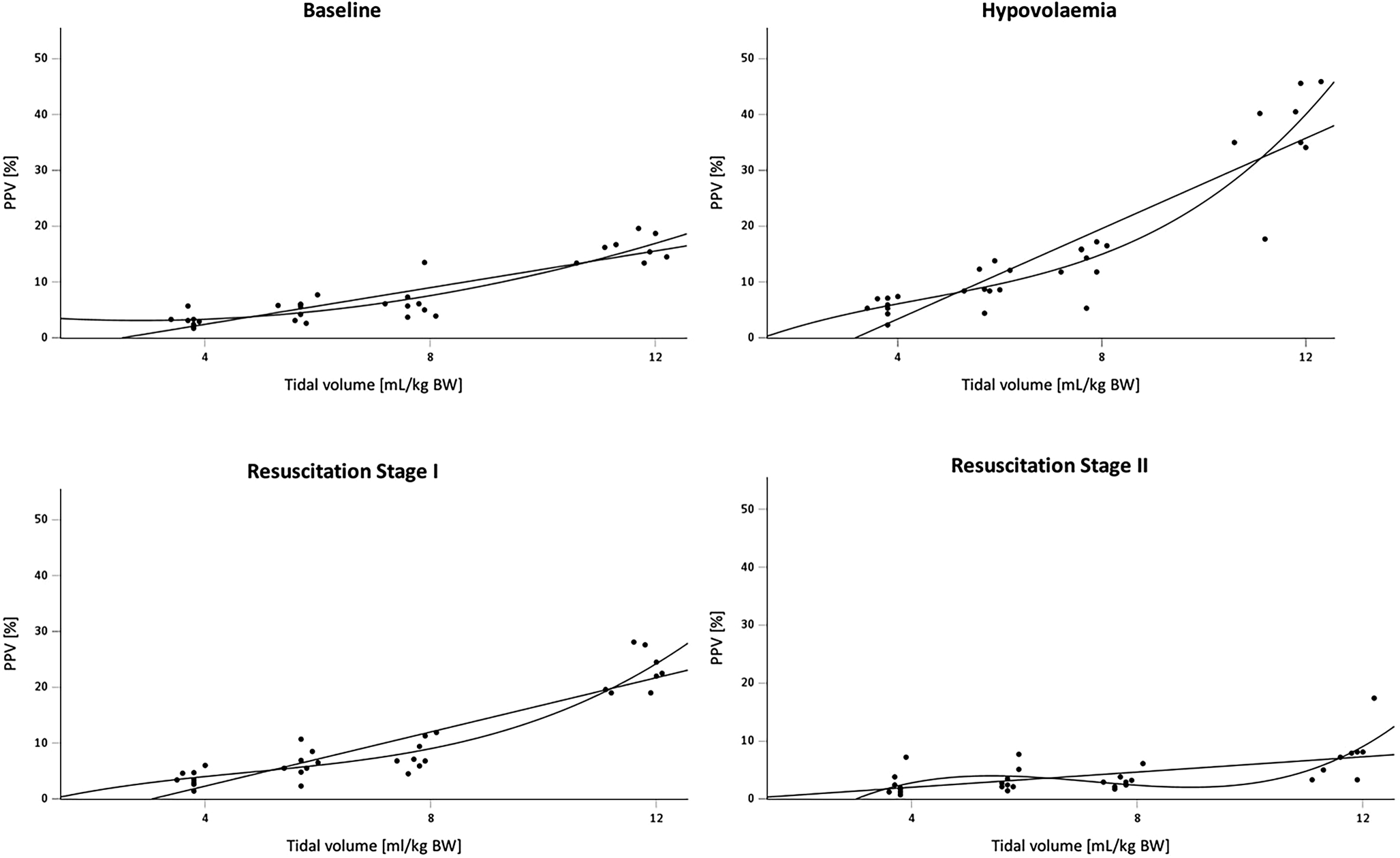 PPV at the respective fluid states and tidal volumes. Regression lines were added with best fit (3rd order) and as linear regression lines with the respective coefficients of determination R2 at baseline (BL): 0.842/0.796, R2 hypovolemia (Hypo): 0.884/0.819, R2 resuscitation stage I (ResI): 0.901/0.833, and R2 resuscitation stage II (ResII): 0.516/0.354