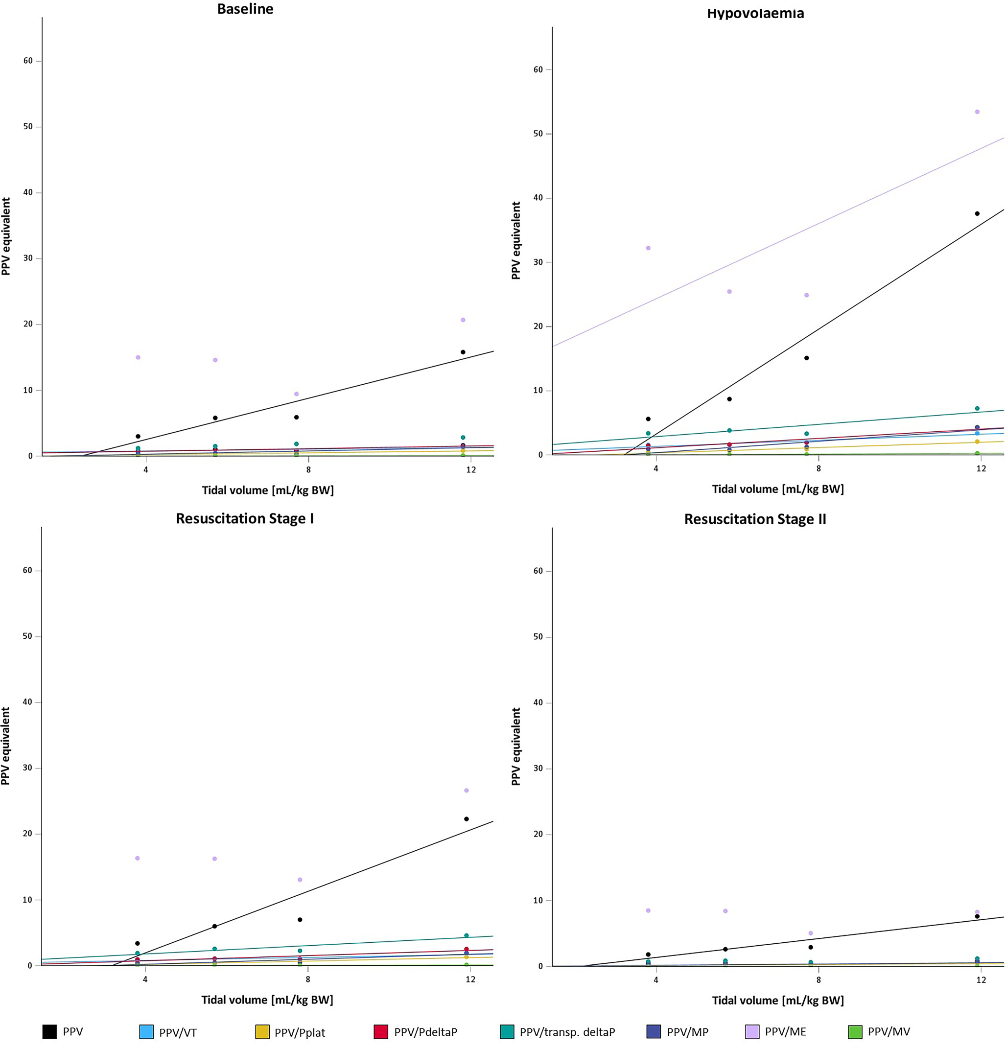 Indexing PPV to ventilatory parameters generally resulted in parameters with less VT-related fluctuations at the higher fluid states, i.e. resuscitation stage II > baseline > resuscitation stage I > hypovolemia. This can be explained by the overall higher values of PPV at the hypovolemic state with greater differences between the tidal volumes compared to the higher fluid states, where values were lower and differences between the tidal volumes less marked.