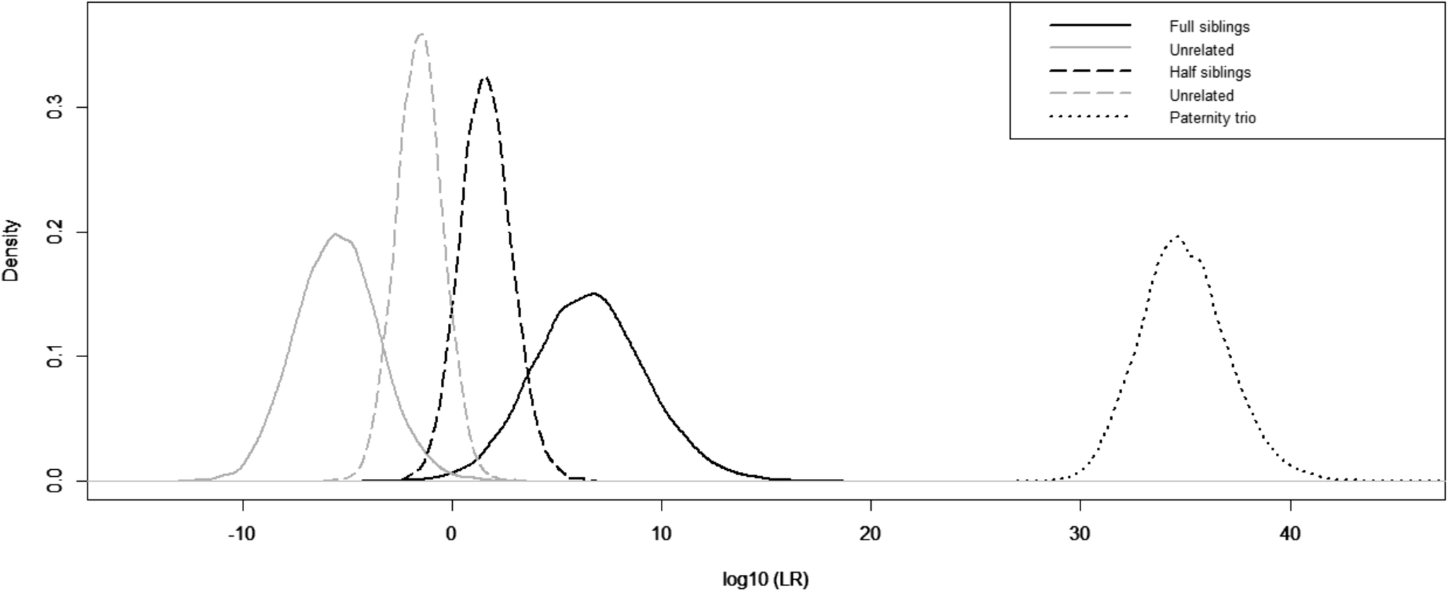 Two tested individuals being full siblings (H1) versus being unrelated (H2)