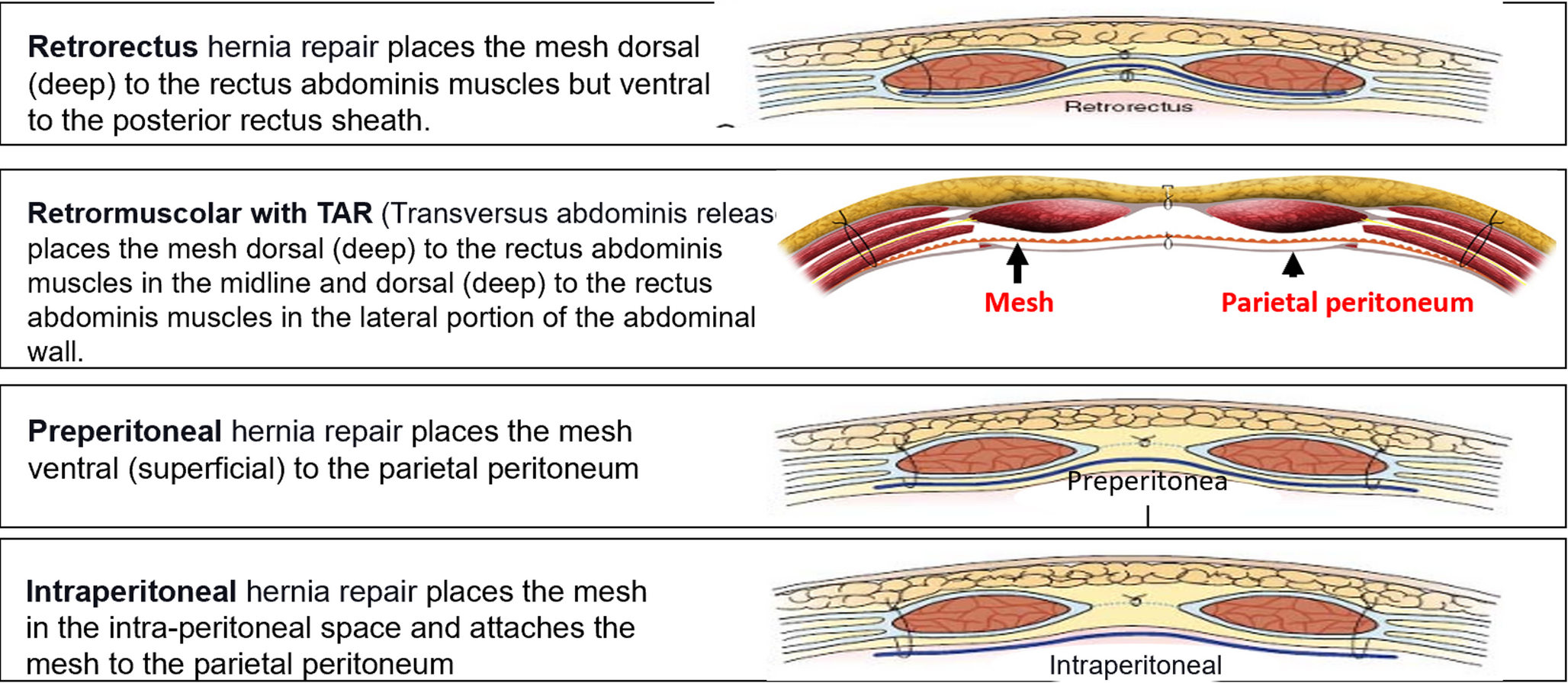 Mesh plane terminology follows the EHS International Classification of Abdominal Wall Planes (ICAP)