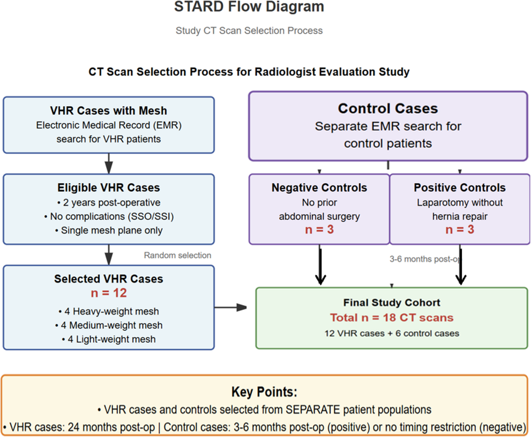 Upon obtaining participants’ consent, an informational institutional email was sent explaining the questionnaire process. The email included a Microsoft PowerPoint file containing 18 CT scan videos with axial, coronal, and sagittal views. These comprised four scans for each mesh type (HWSM, MWSM, and LWSM), along with six control scans (three negative [no surgery] and three positives [surgery without hernia repair]). Participants could freely scroll through the CT videos in the presentation to assess the plane and mesh type without time constraints. All included CT scans met standardized technical parameters: 5 mm slice thickness, standard soft tissue reconstruction kernel, and availability of multiplanar reformats. Computer randomization was used to select the 12 study cases from the eligible cohort, maintaining equal distribution across mesh. The case selection process followed STARD guidelines and involved two separate pathways (Scheme 1). For VHR cases, we searched our EMR system to identify patients who had undergone ventral hernia repair with mesh placement, ultimately selecting 12 cases. Control cases were selected through a separate EMR search of patients without ventral hernia repair, yielding 6 controls (3 negative, 3 positive). The final study cohort comprised 18 CT scans total.