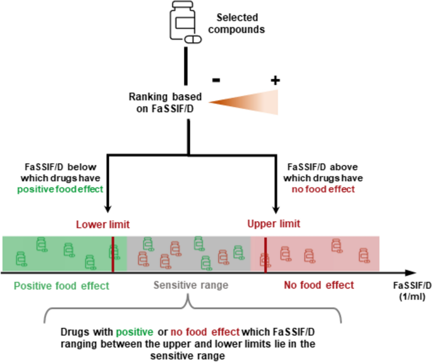 On the basis of the FaSSIF/D ranking, compounds were subdivided into three categories: (i) drugs with no FE, (ii) drugs with positive FE, and (iii) drugs with positive FE/no FE. The lower and upper limits of the sensitivity range (SR), which included drugs with positive FE/no FE, were established based on the FaSSIF/D values from the upper limit of the drugs with positive FE (below the SR) and the lower limit of the drugs with no FE (above the SR) (Fig. 1). The SR was established via two sets of FaSSIF data. The first was the conservative SR determined only for compounds with FaSSIF solubility measured experimentally in this study under the same conditions. The second SR was defined also with the compounds of the conservative SR, as well as using other compounds with literature-reported FaSSIF solubility values assessed under unknown and uncontrolled conditions.