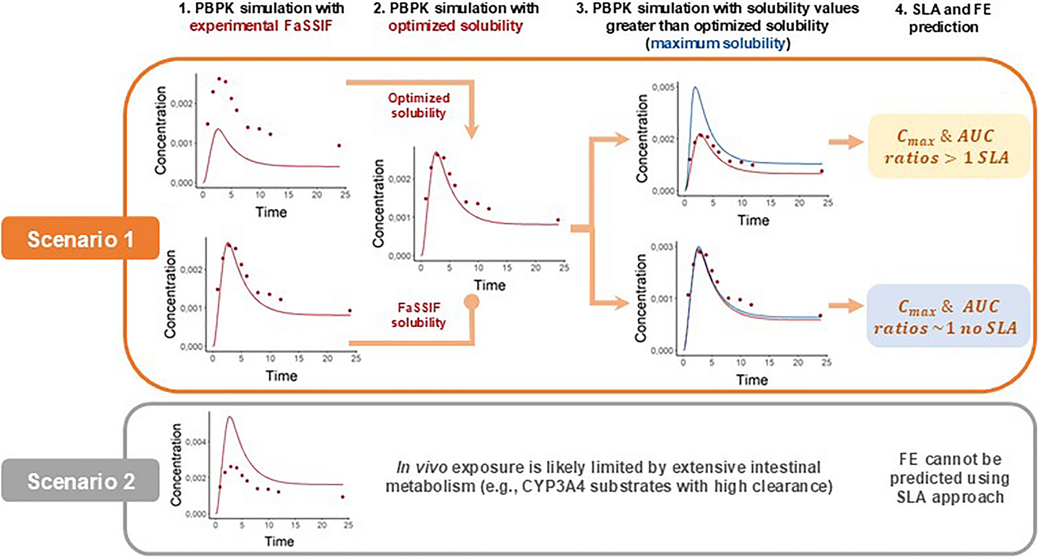 The in vivo SLA was explored as a surrogate for FE prediction for drugs within the SR for which PBPK models were already available in PK-Sim (Open Systems Pharmacology Suite 11.2, www.open-systems-pharmacology.org, 2023). In these models, the model parameters related to systemic disposition (clearance and volume of distribution) were already optimized against observed clinical PK data. The steps for determining SLA are shown in Fig. 2. The model-simulated oral PK profile considering the measured FaSSIF solubility was compared with the oral PK profile observed in fasted state. If no relevant differences between the simulated and observed Cmax were seen, the experimental FaSSIF solubility was considered adequate to describe drug absorption. When simulated area under the curve (AUC) and Cmax were less than the observed parameter values, the measured FaSSIF solubility is said to underpredict in vivo drug absorption due to IVIV disconnect. In this case (Fig. 2, Scenario 1), the solubility value in the model was increased (optimized solubility) until the simulated AUC and Cmax matched the observed data. This optimized solubility is referred to as the “at least” in vivo solubility [21], since the actual in vivo solubility could be even higher than the optimized value if the drug absorption in vivo is not limited by solubility. To confirm that absorption of the drug is not limited by solubility in vivo, the model solubility value was hypothetically increased beyond the best-fit solubility. Depending on the cases described above, the best-fit solubility could be the measured FaSSIF solubility itself or the optimized solubility. A lack of Cmax and AUC sensitivity to increases beyond best-fit solubility confirms that in vivo drug absorption is not limited by solubility. If a stepwise increase in model value of solubility lead to increases in simulated Cmax and AUC, the in vivo drug absorption is said to be limited by solubility. The value of hypothetically high solubility beyond which there are no changes to simulated AUC and Cmax is referred to as maximum solubility. If AUC and Cmax ratios resulting from simulated exposure with maximum solubility and optimized or FaSSIF solubility was > 1, in vivo oral drug absorption is solubility limited and suggests a high probability of positive FE. If the ratios are close to 1, then the in vivo drug absorption is not limited by solubility [21]. When model-simulated Cmax was greater than the observed Cmax, gut metabolism- or efflux-limited absorption are assumed to be the driving factors (Fig. 2, Scenario 2). This conclusion is justified since the models are already optimized for systemic drug disposition due to clearance and volume of distribution using intravenous PK data. For drugs for which the simulated Cmax was greater than the observed, it is not possible to apply the proposed method for positive FE prediction. Graphical and numerical analyses were performed using R programming language version 4.3.1 (The R Foundation for Statistical Computing, Vienna, Austria, 2023) and R studio.