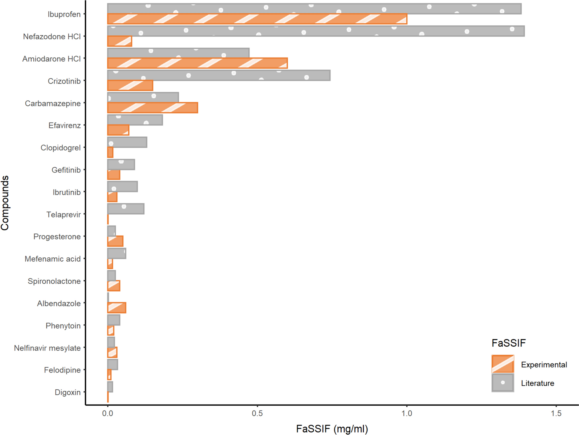 Comparison of experimentally determined and literature-reported FaSSIF values. FaSSIF fasted state simulated intestinal fluid solubility