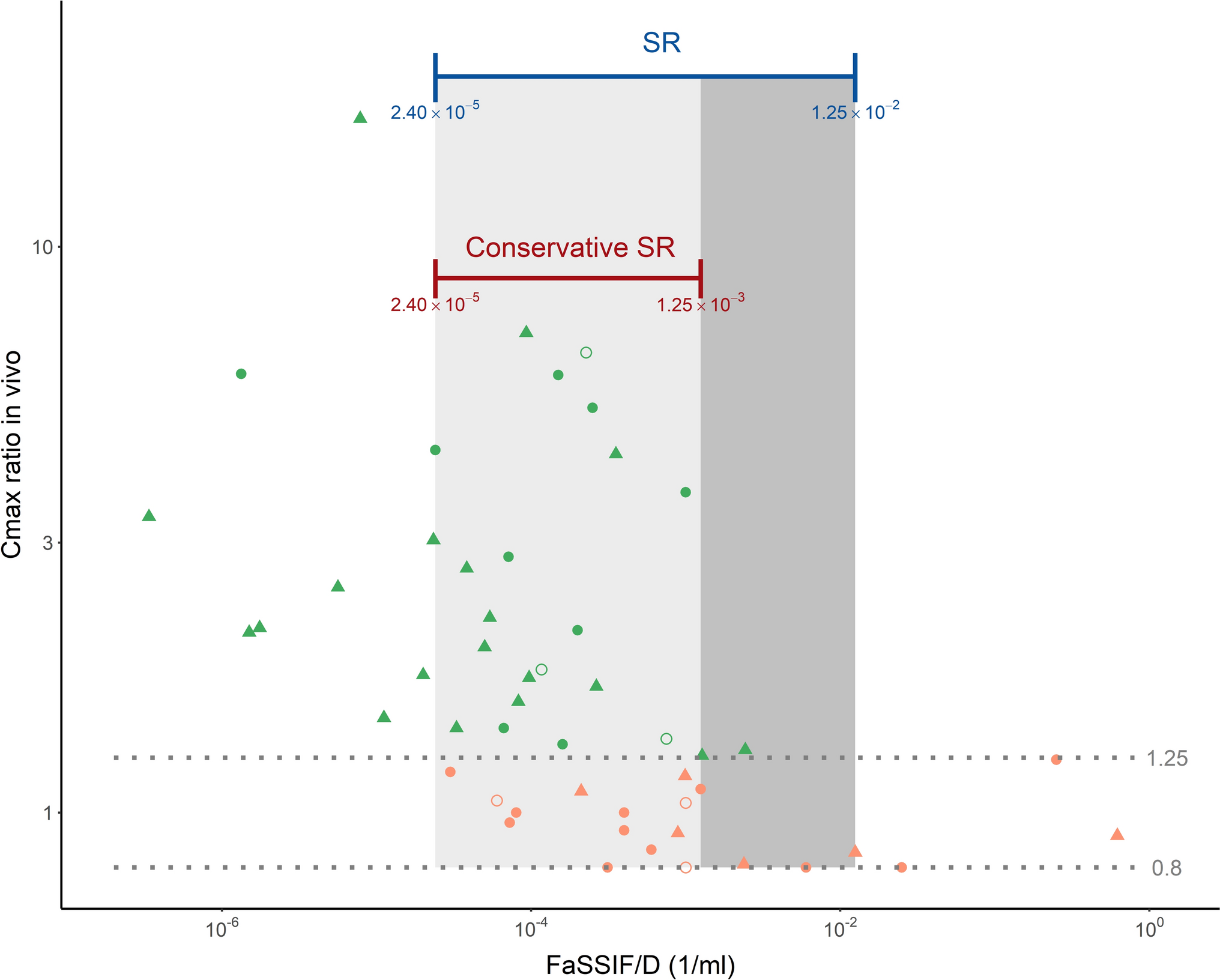 BCS biopharmaceutical classification system, Cmax maximum blood/plasma concentration, D dose, FaSSIF fasted state simulated intestinal fluid solubility, FaSSIF/D dose-adjusted FaSSIF, SR sensitivity range