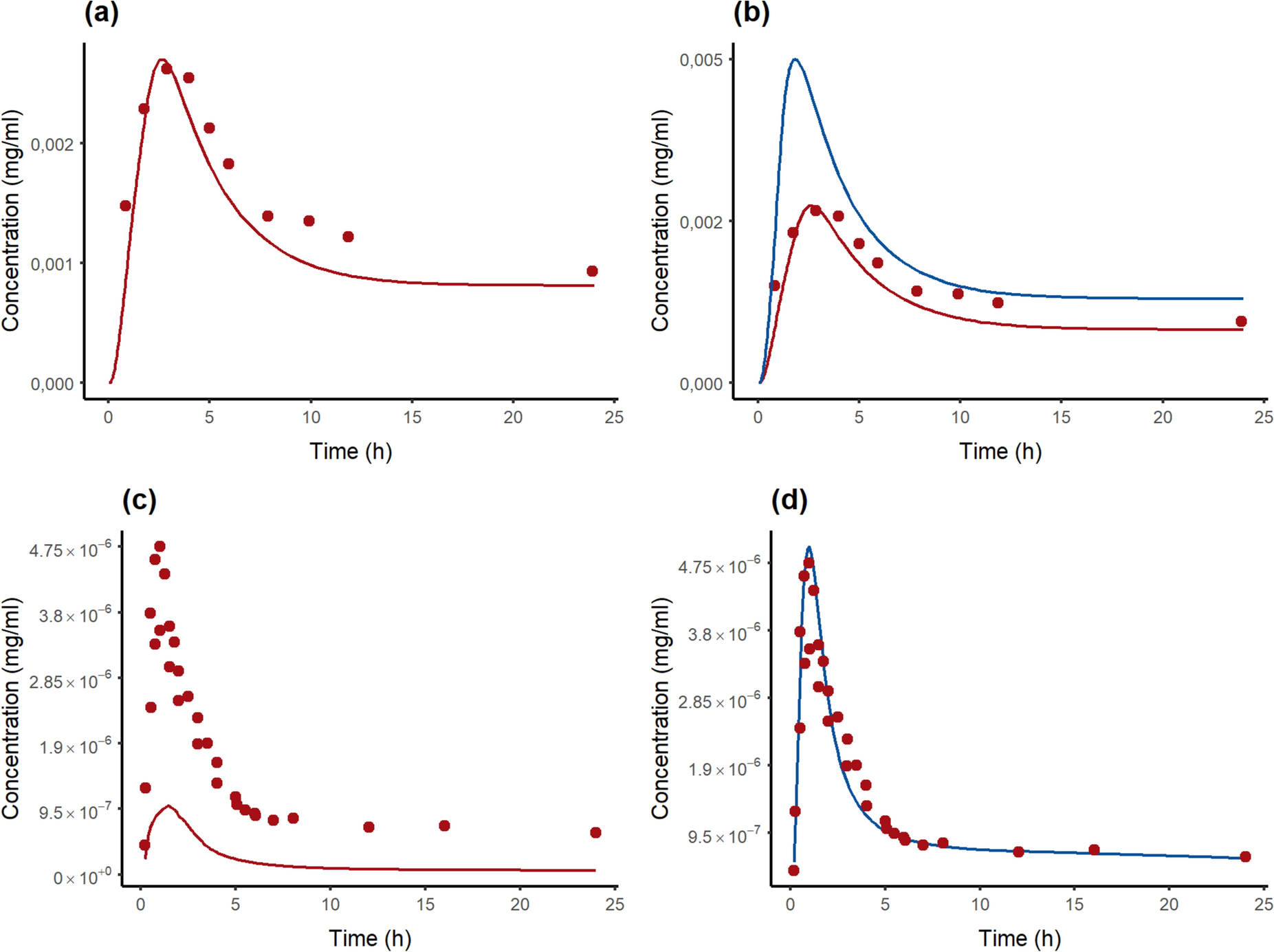 PBPK simulations of fasted PK profiles of efavirenz (a, b) and digoxin (c, d). a Efavirenz 600 mg oral administration simulated with measured FaSSIF solubility. b Efavirenz 600 mg oral administration simulated with optimized (red line) and maximum solubility (blue line). c Digoxin 1 mg oral administration simulated with measured FaSSIF solubility. d Digoxin 1 mg oral administration simulated with optimized (red line) and maximum solubility (blue line), in this case, overlapped. FaSSIF fasted state simulated intestinal fluid.
