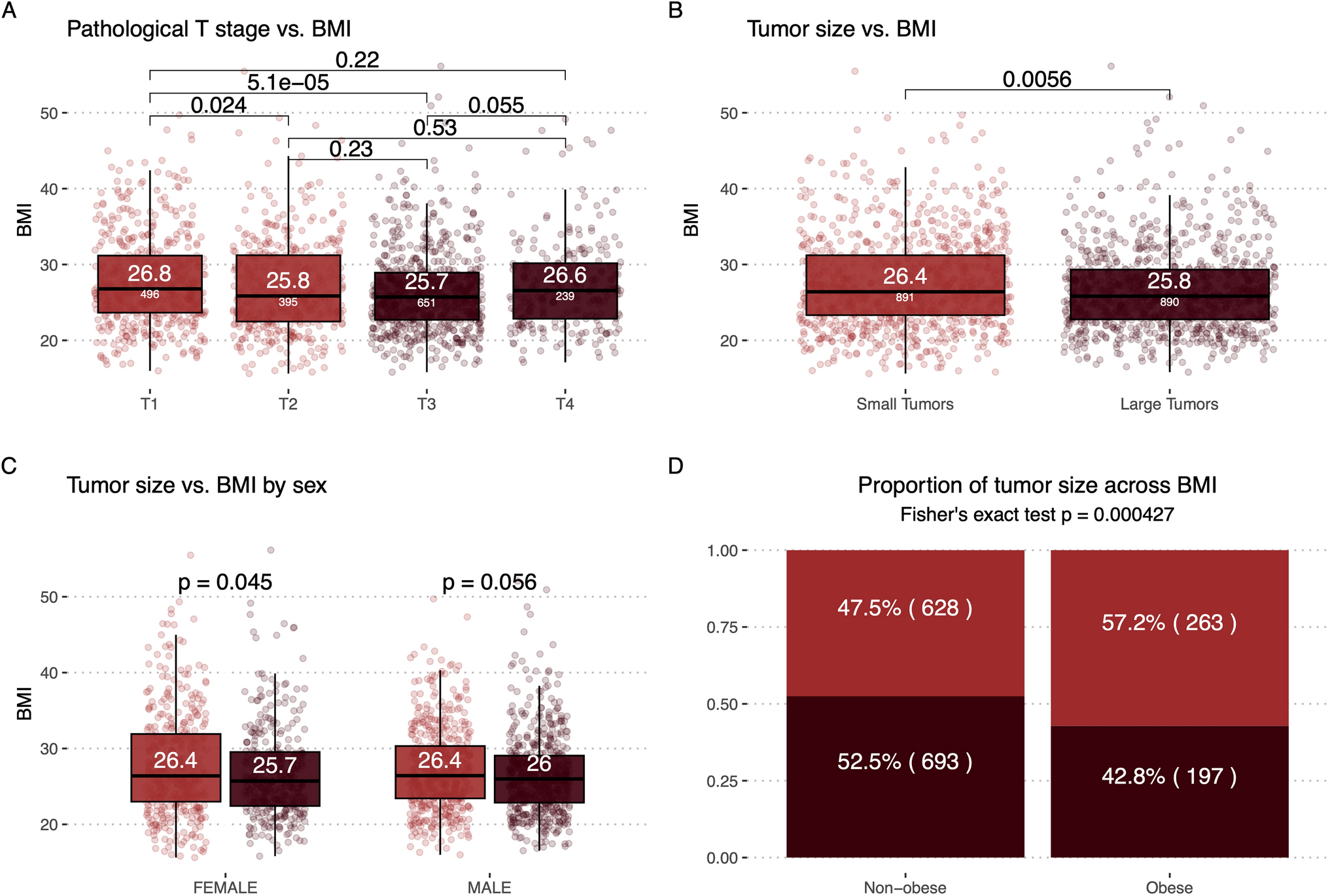 BMI and pathological T-stage on Subset 2. A Patients BMI stratified by their tumor’s pathological T stage. Colored by tumor size (Small: T1 and T2, Large: T3 and T4). B Patients BMI plotted stratified by their tumor size. C Patients BMI plotted against their tumor size stratified by sex. D Patients are stratified by obesity, BMI > = 30, and the proportion of small and large tumors are shown for each group