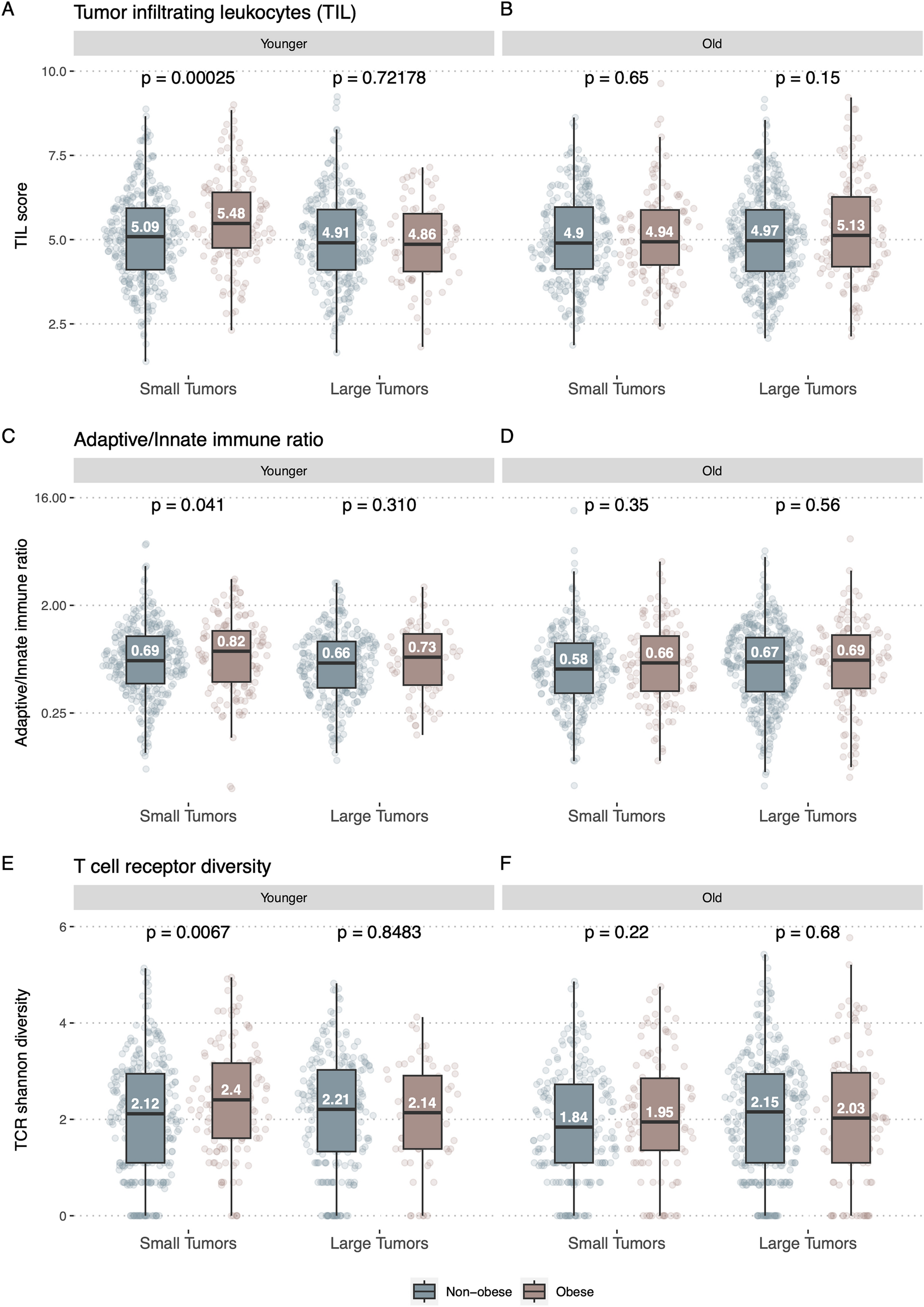 Tumor immune infiltration and diversity. A Tumor Infiltrating leukocytes (TIL) score in the younger (< 60 years) patients. The patients are stratified by tumor size and colored by obesity (non-obese: BMI < 30, obese: BMI > = 30). B TIL score in the older (> = 60 years) patients. The patients are stratified by tumor size and colored by obesity. C Adaptive/innate immune ratio of younger patients. The patients are stratified by tumor size and colored by obesity. The Y-axis is log2-scaled. D Adaptive/innate immune ratio of older patients. The patients are stratified by tumor size and colored by obesity. The Y-axis is log2-scaled. E T-cell receptor (TCR) shannon diversity of younger patients. The patients are stratified by tumor size and colored by obesity. F TCR shannon diversity of older patients. The patients are stratified by tumor size and colored by obesity