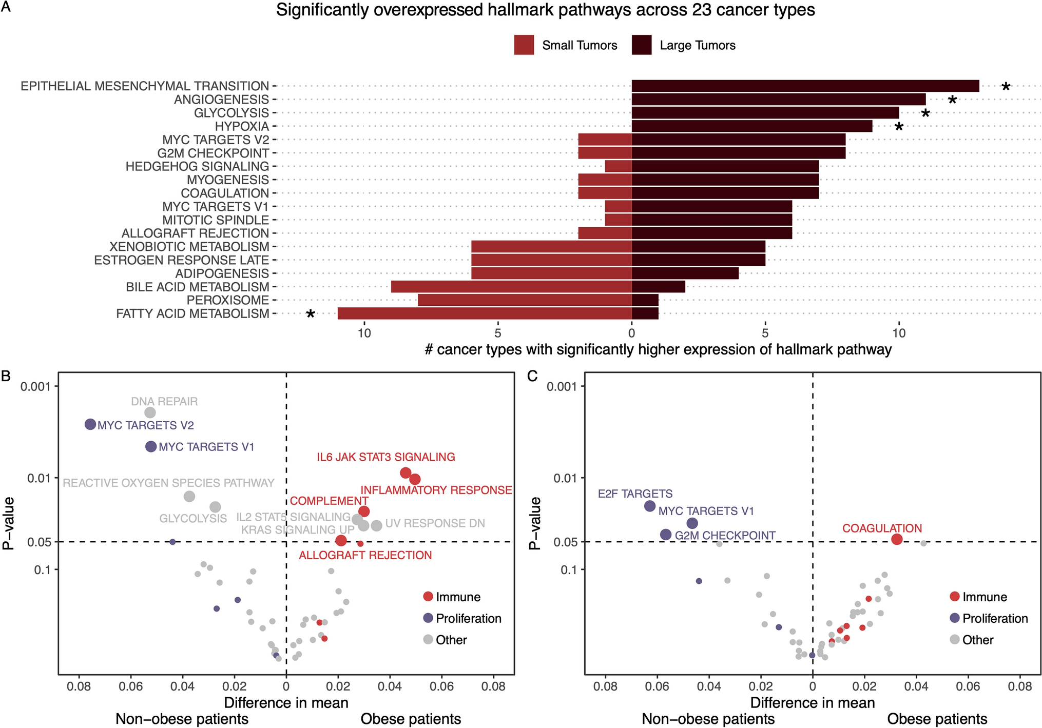 Differences in pathway expression in small and large tumors. A A bar plot showing the pathways where there are more than 5 cancer types with an overexpression in small or large tumors, and the number of cancer types that are significantly overexpressed in either direction. An asterisk, *, marks the pathways where the distribution of cancer types into small or large are significantly different from 50/50, given a binomial distribution. This analysis is performed on Subset 1. B A volcano plot showing the difference of mean (and p-value given a t-test) GSVA values for each pathway between non-obese and obese patients with small tumors. The pathways are colored by their overall process category. This analysis is performed on Subset 2. C A volcano plot showing the difference of mean (and p-value given a t-test) GSVA values for each pathway between non-obese and obese patients with large tumors. The pathways are colored by their overall process category. This analysis is performed on Subset 2