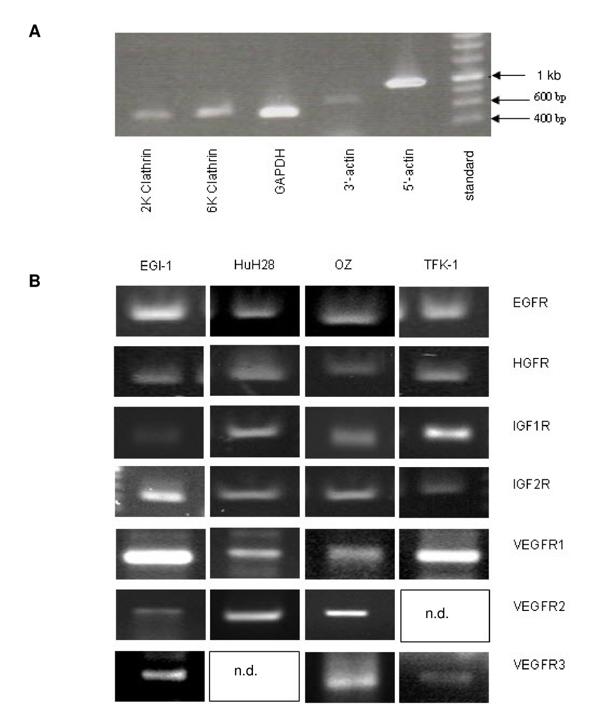 RT-PCR for housekeeping genes and growth factor receptors. A) PCR analysis to ensue the presence and integrity of five housekeeping genes from TFK-1, representative for all cell lines used. B) mRNA expression of growth factor receptors in four CC cell lines (n. d. = not detected).
