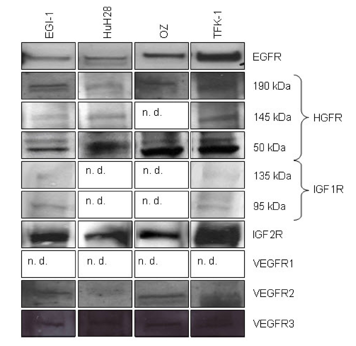 Western blot for growth factor receptors from different CC cell lines. EGFR, HGFR, IGF2R, VEGFR2 and 3 was detected in EGI-1, HuH28, OZ and TFK-1. IGF1R was visualized in EGI-1 and TFK-1. VEGFR1 was not in the investigated cell lines (n. d. = not determined).