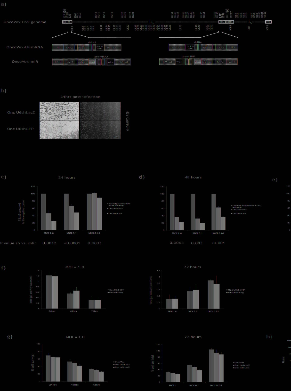 To investigate the properties of oncolytic HSV expressing shRNA or miRNA, we performed an MTS cell viability assay at 24, 48 and 72 hours on BHK-LacZ cells infected with the oncolytic backbone virus OncoVEX, Onc U6shLacZ or Onc miR-LacZ at MOIs 1.0, 0.1 and 0.01. Furthermore, we prepared growth curves for these viruses using the same time points. Figures 1g and 1h demonstrate that expression of shRNA/miRNA from the LAT region does not significantly influence the cytopathic effect and growth properties of oncolytic HSV, respectively. Figure 1g further demonstrates that cell death increases with time and MOI of virus.