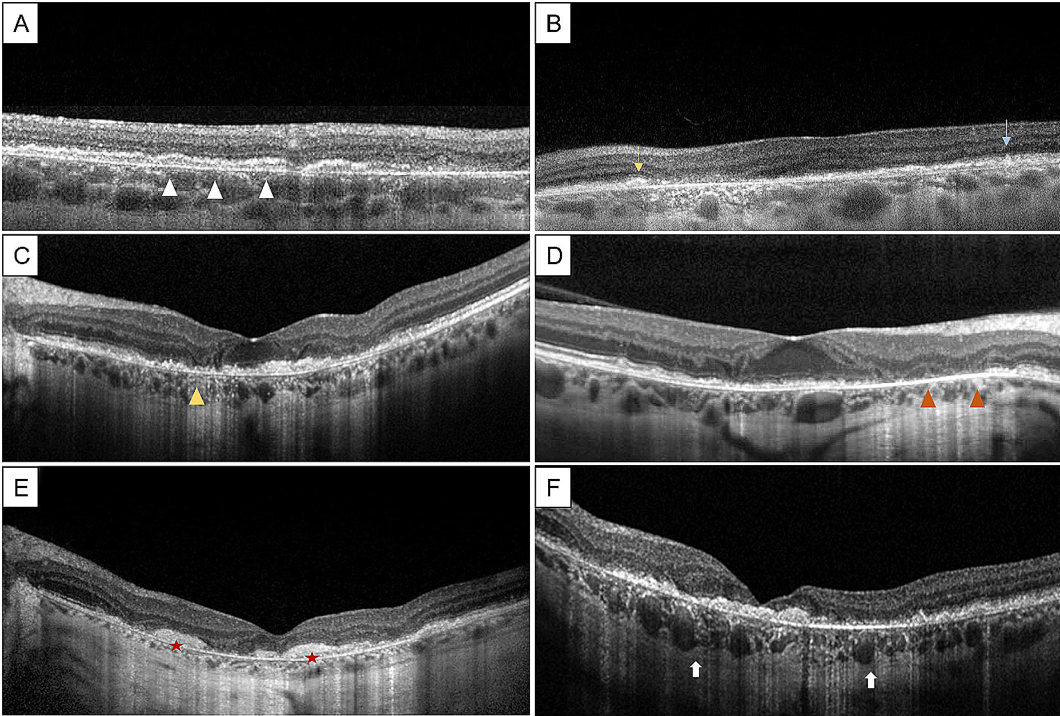 Optical coherence tomography B-scans in extensive macular atrophy with pseudodrusen (EMAP), at different stages of evolution. A Early findings show an initial retinal pigmented epithelium-basal lamina-Bruch’s membrane (RPE-BL-BrM) complex splitting (white arrowheads) with an overlying dysmorphic and irregular RPE in the superior perifovea. B Subretinal deposits (SDDs) may show a “ribbon” shape (yellow arrow) or a “dot” shape (turquoise arrow). C In intermediate stages, RPE-BL-BrM splitting is visible in the foveal area, with hyperreflective material under the RPE. Moreover, a localized area of complete RPE and outer retinal atrophy (cRORA) is visible (yellow arrowhead); D Macular scan showing collapse of the nasal perifoveal outer retinal layers with choroidal hypertransmission (yellow arrowheads), while the fovea is still unaffected and shows RPE irregularities; E In late stages of the disease, cRORA involves the foveal area and subretinal fibrosis may develop (red stars). F Complete choroidal hypertransmission with clear visibility of choroidal vessels (white arrows) due to complete RPE atrophy.