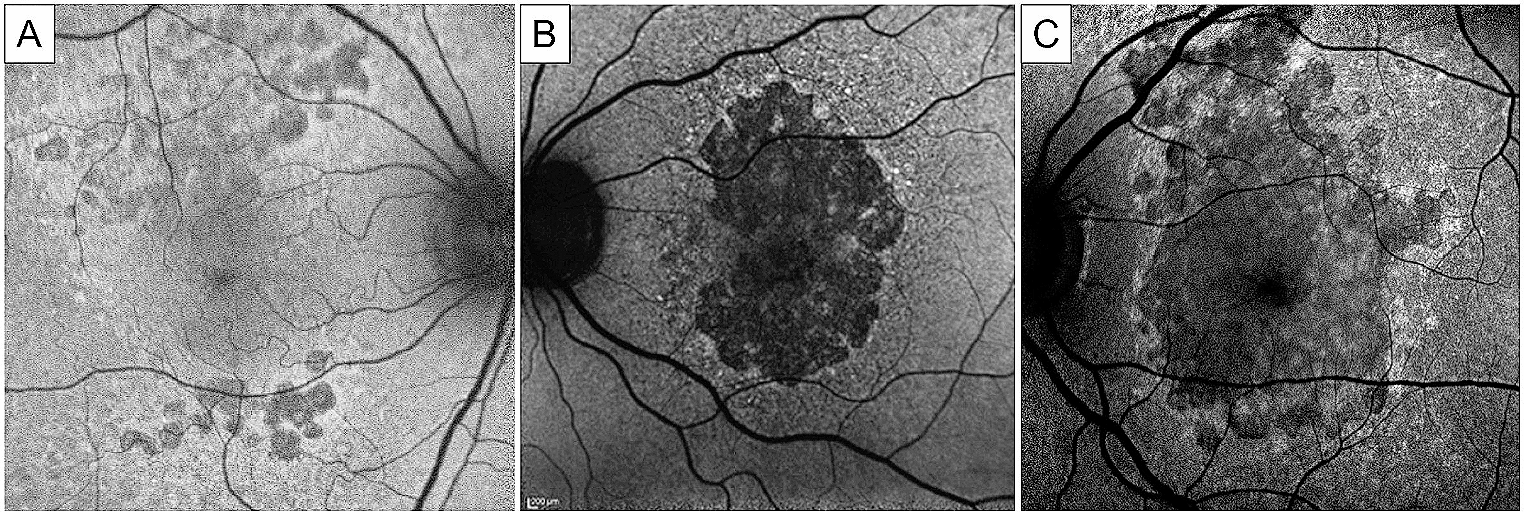 Blue fundus autofluorescence photographs of extensive macular atrophy with pseudodrusen (EMAP), showing the classic evolution pattern. Hypoautofluorescence lobular lesions are visible in perifoveal areas, particularly the superior perifovea (A). These multifocal lesions tend to coalesce into a single patch of dark and sharply demarcated atrophy, initially not affecting the fovea (B). In advanced stages, a vertically oriented area of atrophy involves the macular region and involves the fovea (C). Note the hyperautofluorescent rim visible at the boundaries of the atrophic lesion. Courtesy of Antropoli et al. [41], Romano et al. [4] and Vilela et al. [9]