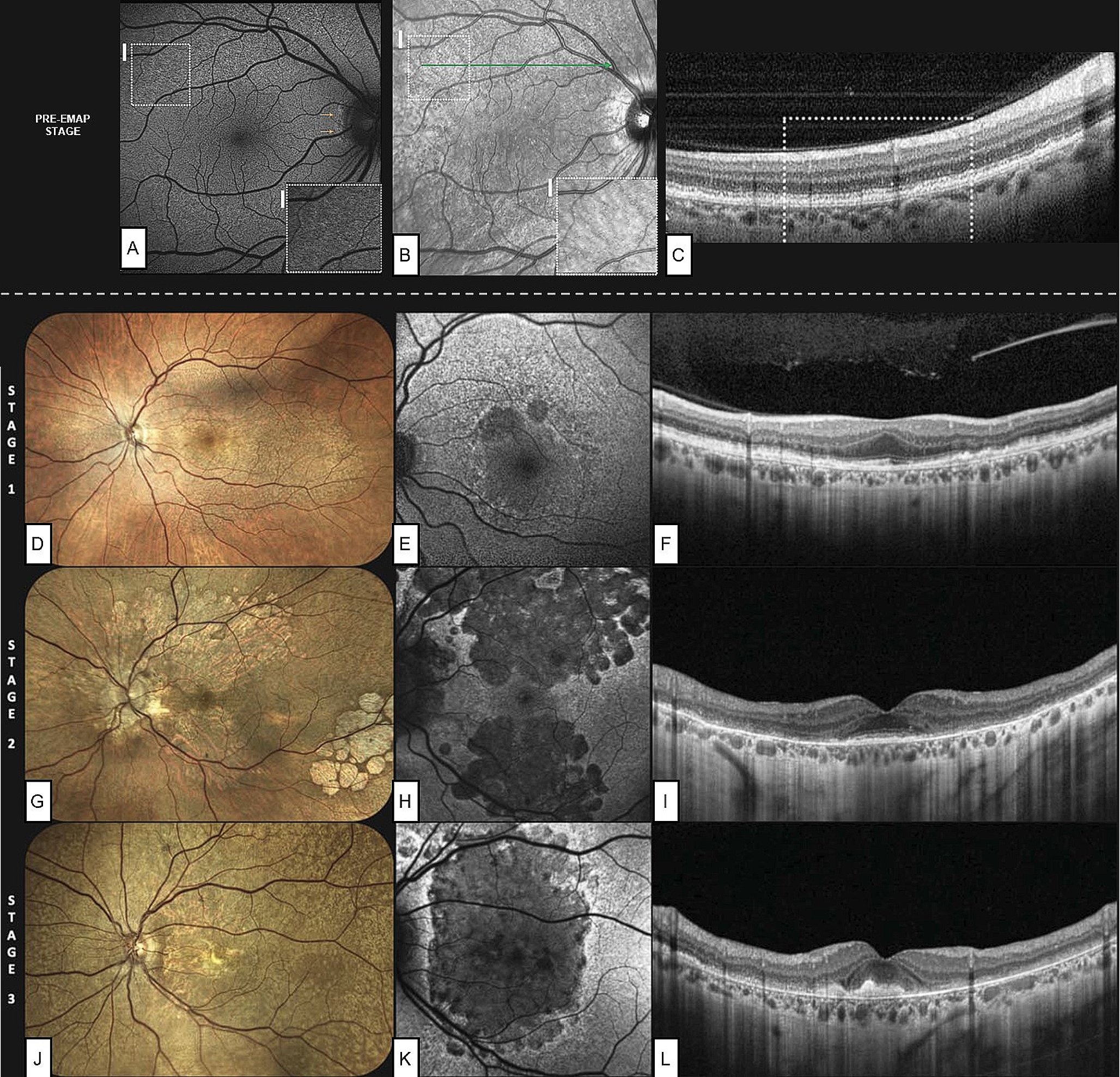 Staging system proposed by Romano et al., with the addition of the pre-extensive macular atrophy with pseudodrusen (pre-EMAP) stage, proposed by Fragiotta et al. Mild autofluorescence (A) and infrared (B) alterations are visible in the superior perifovea, corresponding to RPE granularity (C) and initial splitting of the retinal pigmented epithelium-basal lamina-Bruch’s membrane (RPE-BL-BrM) complex. Fundus photographies (D, G, J), fundus autofluorescence (E, H, K) and optical coherence tomography scans passing through the fovea (F, I, L), show the progressive atrophy involving the posterior pole and assuming a vertically-oriented shape.