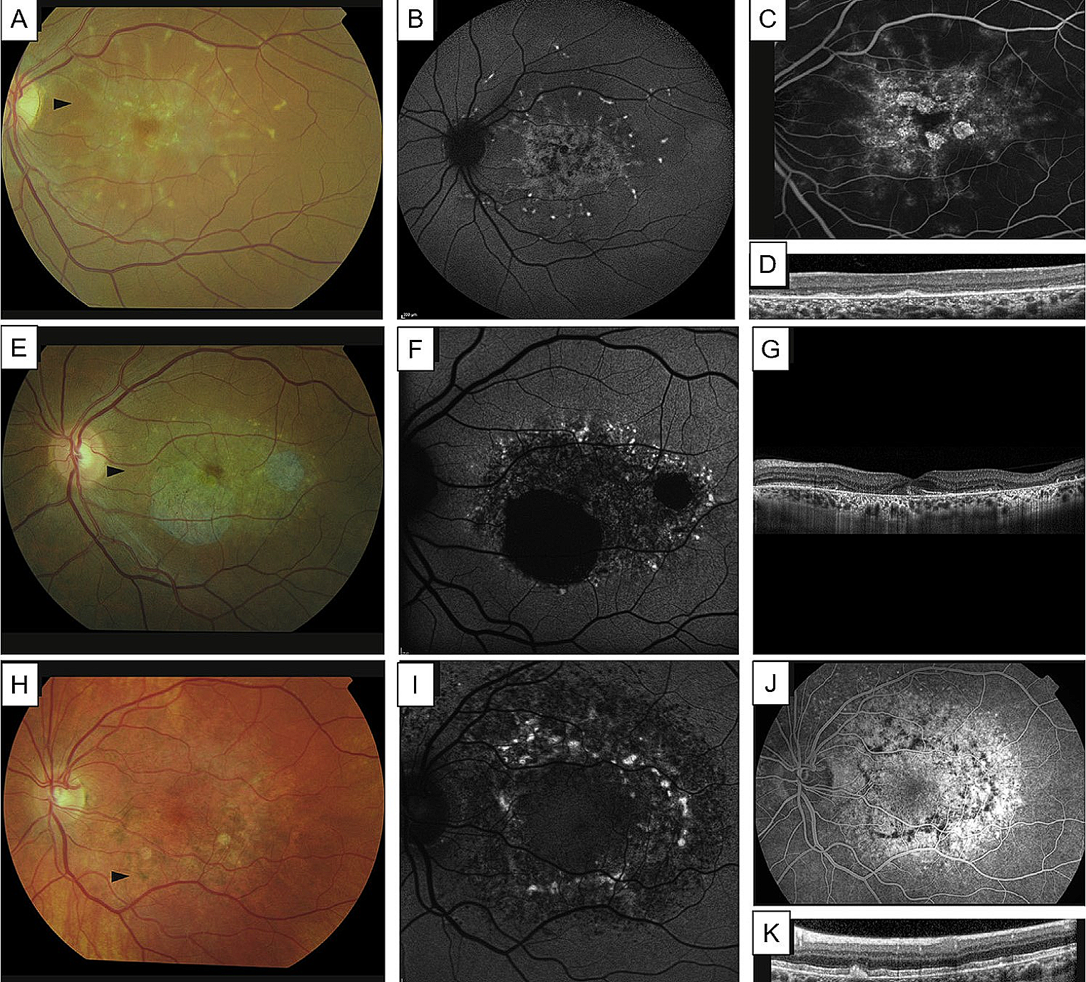 Multimodal imaging of differential diagnosis of extensive macular atrophy with pseudodrusen (EMAP) with other retinal dystrophies. (A-D) Late-onset Stargardt disease, showing flavimaculatus flecks scattered throughout the posterior pole (A, B), the presence of a “dark choroid” at fluorescein angiography (C) and hyperreflective thickening of retinal pigmented epithelium (RPE) layer at the optical coherence tomography (OCT) scan (D). (E-G) Central areolar choroidal dystrophy linked to PRPH2 mutation, showing hypopigmentation of the macula with oval-to-round, atrophic areas (A) and corresponding areas of severely decreased to absent autofluorescence with perilesional spots of hyperautofluorescence (F). (G) Horizontal OCT scan showing well circumscribed chorioretinal atrophy. (H-K) m.3243 A > G Macular dystrophy, visible as hyperpigmented irregular spots in the macula and an oval area of mottled hypopigmentation at fundus photography (A). Fundus autofluorescence (FAF) image showing that ovally-shaped hyperautofluorescent areas, corresponding to hyperpigmented spots, and diffuse irregular hypoautofluorescence (I). Fluorescein angiography (FA) showing blockage of background fluorescence in the area of hyperpigmentation and a diffuse hyperfluorescence due to a RPE window defect (J). Hyperreflective spots originates from dome-shaped hyperreflective lesions of the RPE visible at OCT scans (K). Courtesy of Saksens et al. [39]