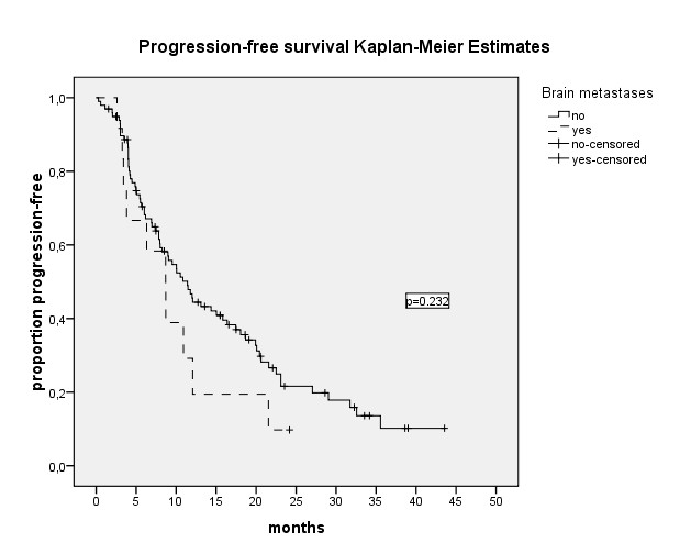 With the advent of these novel agents, extracerebral disease control is enabled in the majority of patients. As patients with BM are endangered by distant metastases rather than brain metastases, we hypothesized that response rates, progression-free survival and overall survival should be similar in patients with and without BM. The aim of this retrospective analysis was to compare the outcome of patients with and without BM since the start of the era of targeted agents and to investigate whether progression of brain metastases is the most limiting factor for overall survival.