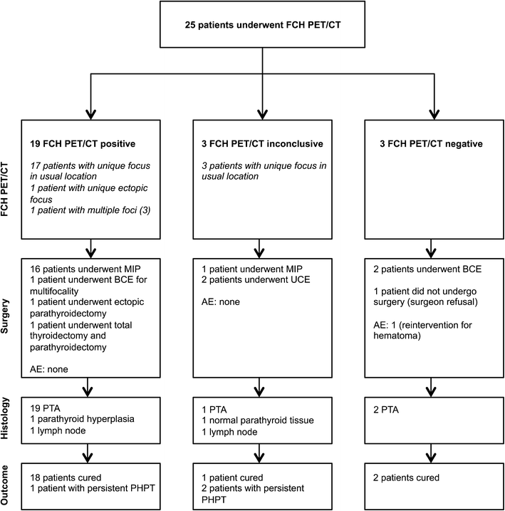 Our study has several limitations. Firstly, the number of eligible patients was not recorded. The APACH1 protocol was only proposed to patients with PHPT and negative or inconclusive conventional imaging results with an indication for surgical management. Secondly, the delay of four weeks between the FCH PET/CT and surgery could not always be respected, for practical reasons and the absence of medical urgency. However, we feel this protocol violation did not significantly influence the results. Thirdly, in theory, for more precise estimates of the diagnostic performance of FCH PET/CT for PTA localization, BCE should have been performed in all patients. For ethical reasons though, this did not seem feasible. Furthermore, intra-operative PTH measurements were not available in both centers. Lastly, long term follow-up to confirm the maintenance of normocalcemia was not part of our prospective study protocol.