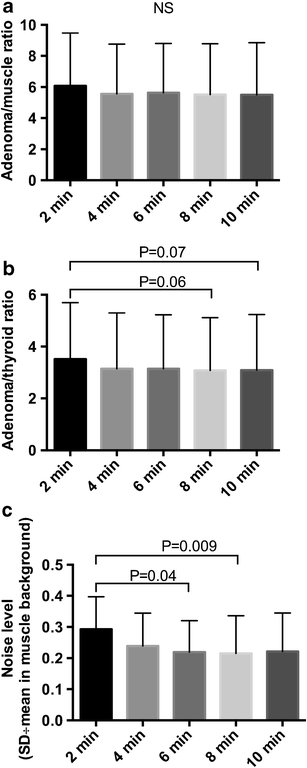 Semi-quantitative analyses of the (a) PTA-to-muscle ratio (b) PTA-to-thyroid ratio and (c) noise level in the muscle background for the list-mode PET acquisitions reconstructed with an increment of 2 min