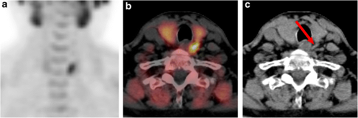 Another PET tracer studied for preoperative PTA detection is C11-methionine. Reported sensitivities from two recent meta-analyses vary from 69% to 81%, and the per-patient detection rate was estimated at 70% [23, 24]. Thus, it seems that FCH PET/CT has a superior performance than C11-methionine PET/CT for PTA detection. In terms of availability, the balance is largely in favor of the widely available tracer FCH, as C11-methionine production requires an on-site cyclotron due to its short half-life.