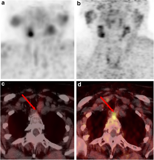 MIBI SPECT/CT and FCH PET/CT images of a 68-y-old female patient with PHPT, an inconclusive cervical ultrasound report (dubious right inferior focus only visible on one plane) and a negative MIBI SPECT/CT. (a) MIBI SPECT maximum-intensity-projection, (c) MIBI SPECT/CT transverse slice, (b) FCH PET maximum-intensity-projection, and (d) FCH PET/CT transverse slice. The MIBI and FCH MIP images (a, b) did not show clear focal uptake in the lower neck. However, the FCH PET/CT transverse slice (d) showed increased FCH uptake in a small ectopic deep-laying left-sided PTA in the upper mediastinum, which was negative on MIBI SPECT/CT (c) (red arrows). Successful ectopic parathyroidectomy was performed, leading to cure