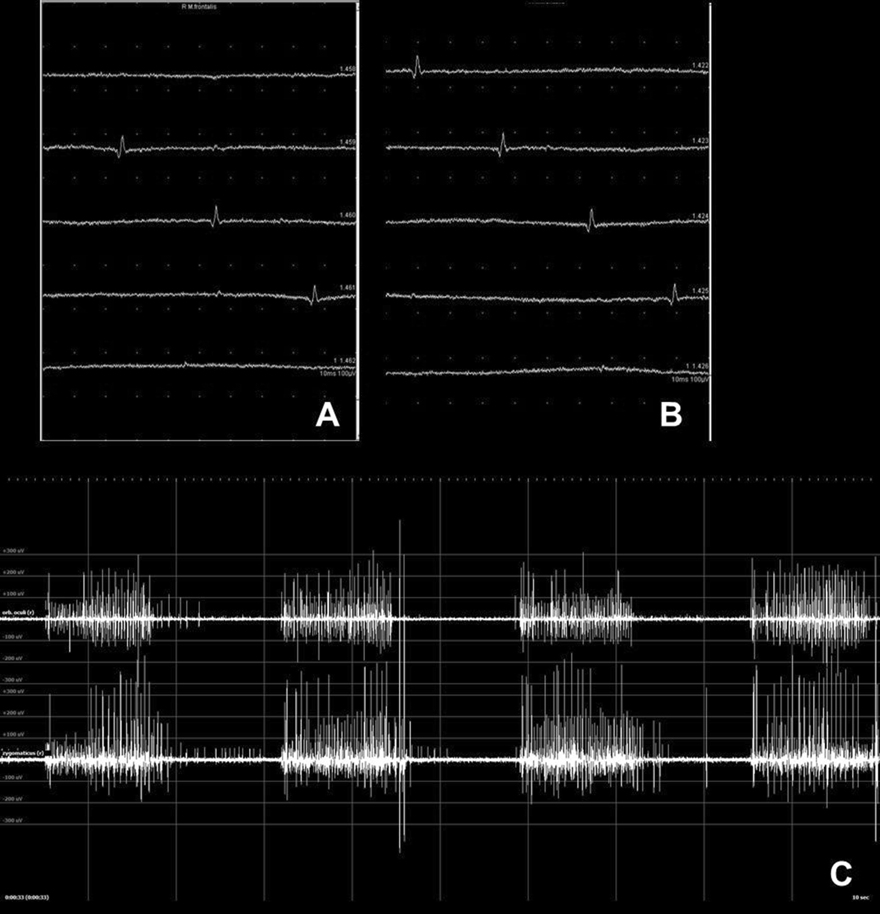 Recommendation: A standardized scheme and sequence should be used for recording facial muscles. An EMG of the frontalis, orbicularis oculi, orbicularis oris, and zygomaticus muscles on the affected side gives a good overview of facial nerve function. If only part of the peripheral facial nerve is affected, nEMG also is abnormal only in the affected area.