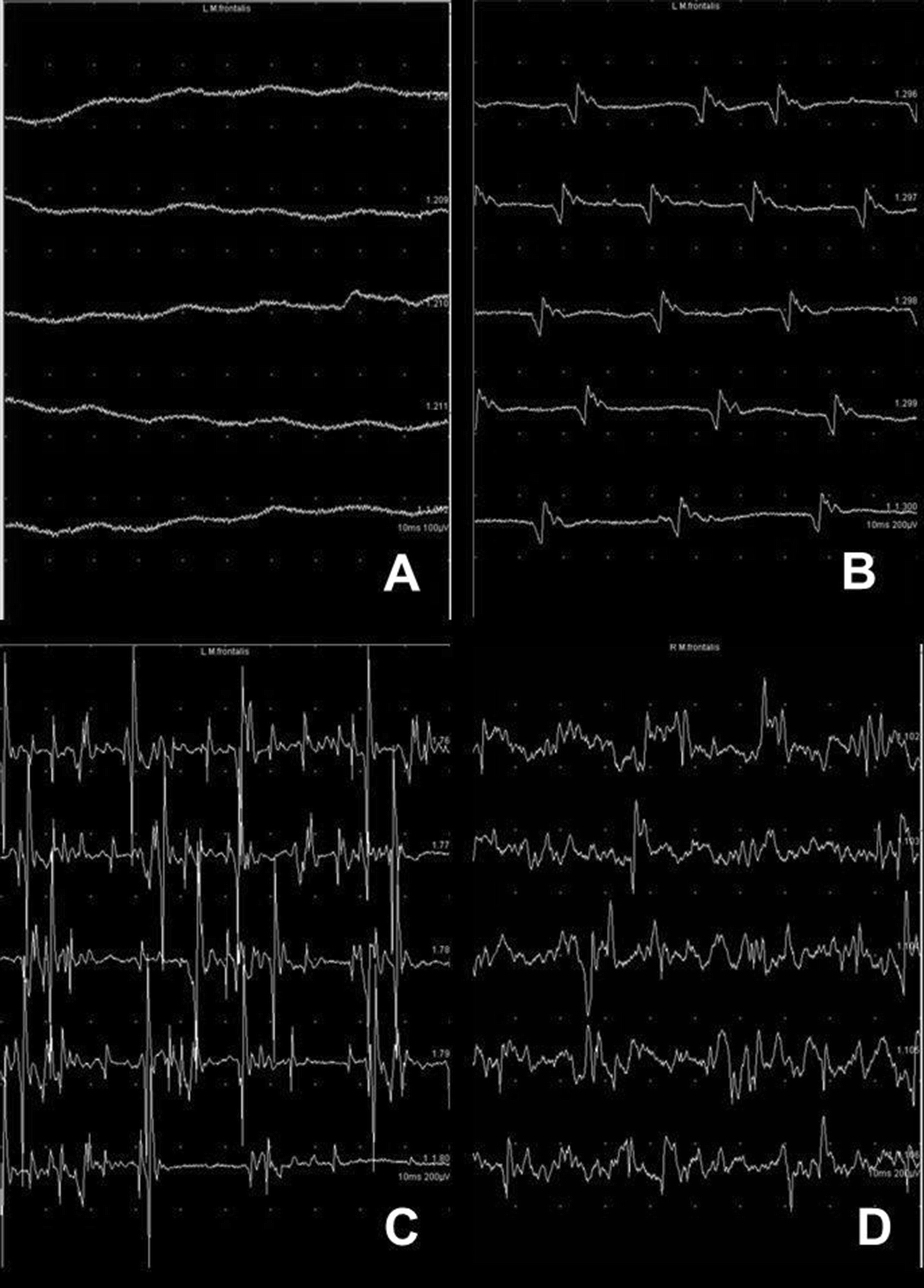 Needle electromyography (nEMG) recordings during voluntary muscle movement showing examples of different activation patterns in the frontalis muscle recorded with a concentric needle electrode 0.45 × 38 mm during contraction: a no activity in a patient with acute complete facial paralysis, b single-fiber pattern in a patient with acute incomplete facial palsy, c decreased recruitment pattern with some polyphasic reinnervation potentials in the phase of regeneration two months after the onset of acute palsy, d normal/dense recruitment pattern with some polyphasic reinnervation four months after the onset of acute palsy