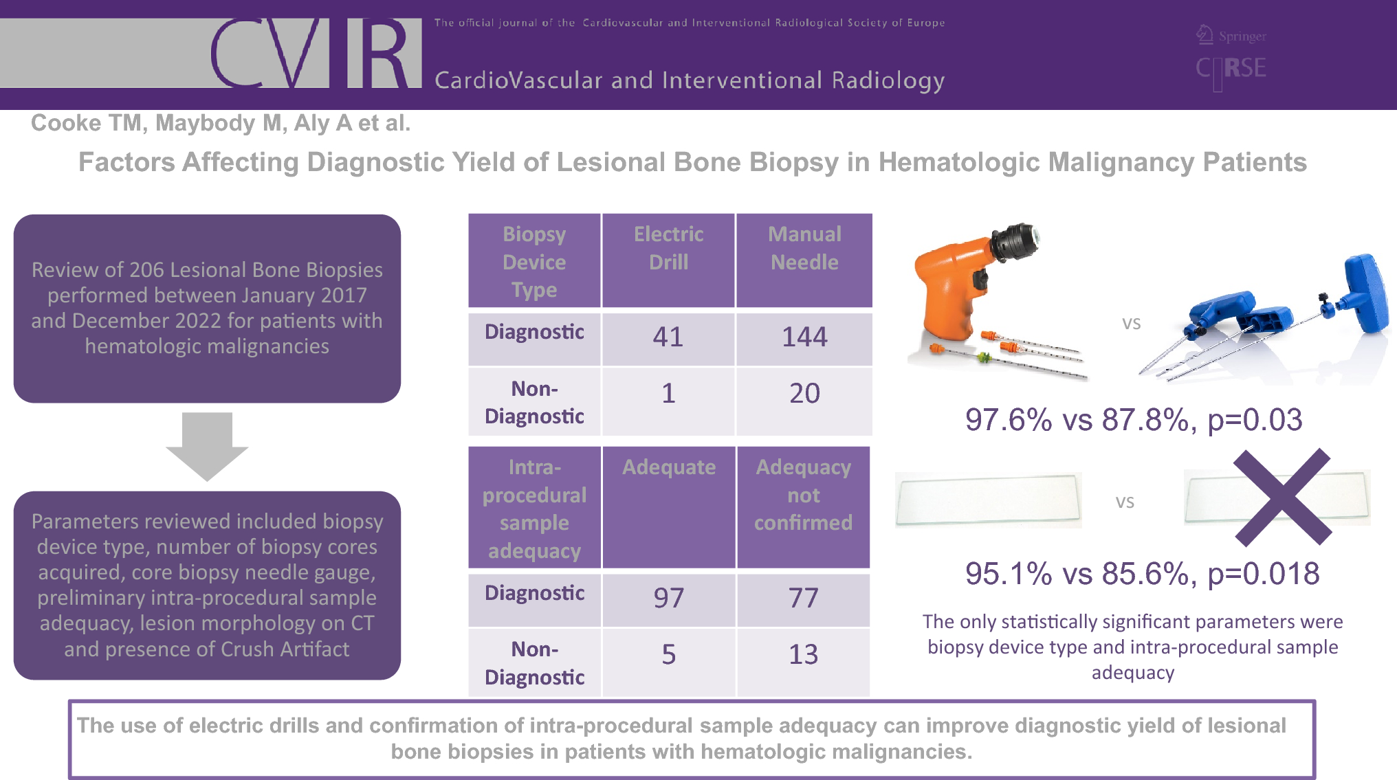 This retrospective study included 206 lesional bone biopsies in 182 patients with a hematologic malignancy between January 2017 and December 2022. The parameters that were reviewed to evaluate diagnostic yield included biopsy device type (manual vs. electric-powered drill), number of biopsy cores acquired, core biopsy needle gauge, preliminary intra-procedural sample adequacy (touch preparation cytology determining if samples are adequate for final pathologic examination), lesion morphology on Computed Tomography (CT), and presence of crush artifact.