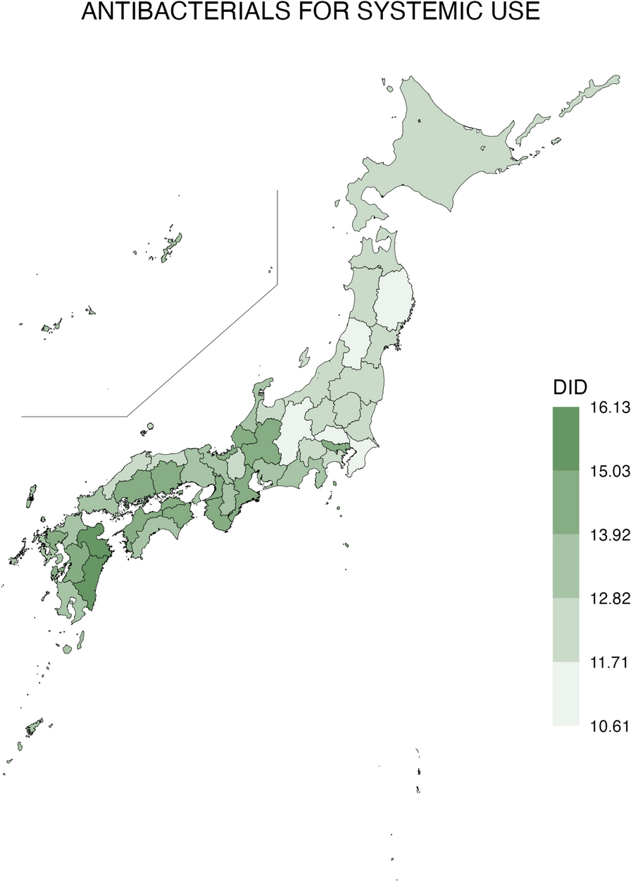 The study included 605,391,054 defined daily doses of AMU in 2019 from the 47 prefectures. The characteristics of the prefecture-level AMU and variables are presented in Table 1. The AMUs in the 47 prefectures varied with a median of 13.1 DID (IQR 12.0–14.3). Figure 1 shows the geographical variation of AMU (DID) for all systemic antimicrobials. The trend of higher AMU in Western Japan was observed compared with Eastern Japan.