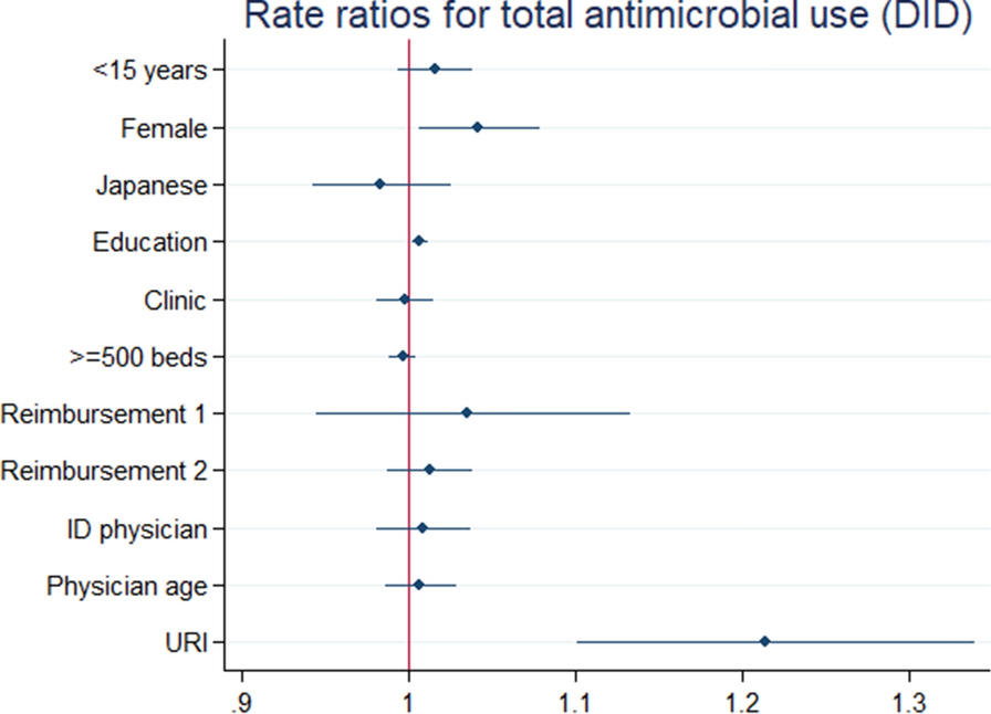 Adjusted rate ratios of prefecture-level total antimicrobial use (DID) in 2019 by investigated variables. The dots and lines represent the point estimates and 95% confidence intervals, respectively. The adjusted rate ratios of proportional variables are presented for a 1% increase in each variable. The variable labels are defined as follows. Female, the proportion of female individuals in the population; < 15 years, the proportion of people aged < 15 years in the population; Education, the proportion of upper secondary graduates going to further education; Clinic, the number of clinics per 1000 inhabitants; ≥ 500 beds, the proportion of hospitals with > 500 beds; Reimbursement 1, the number of hospitals with additional reimbursement for infection prevention 1 per 100,000 inhabitants; Reimbursement 2, the number of hospitals with additional reimbursement for infection prevention 2 per 100,000 inhabitants; ID physician, the number of certified infectious disease specialist physicians per 1000 inhabitants; Physician age, the average age of physicians; URI, the annual number of diagnoses related to upper respiratory infections per inhabitant