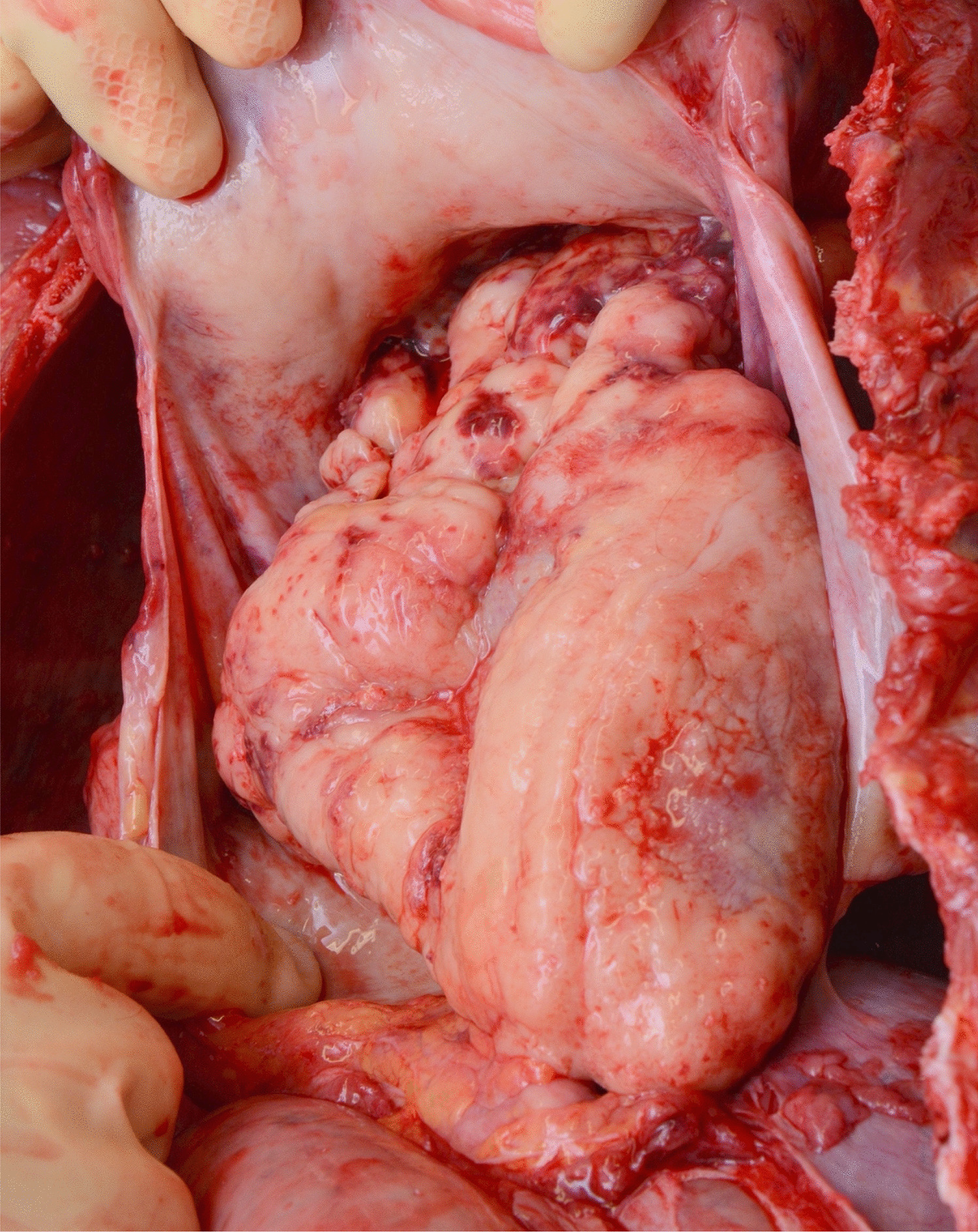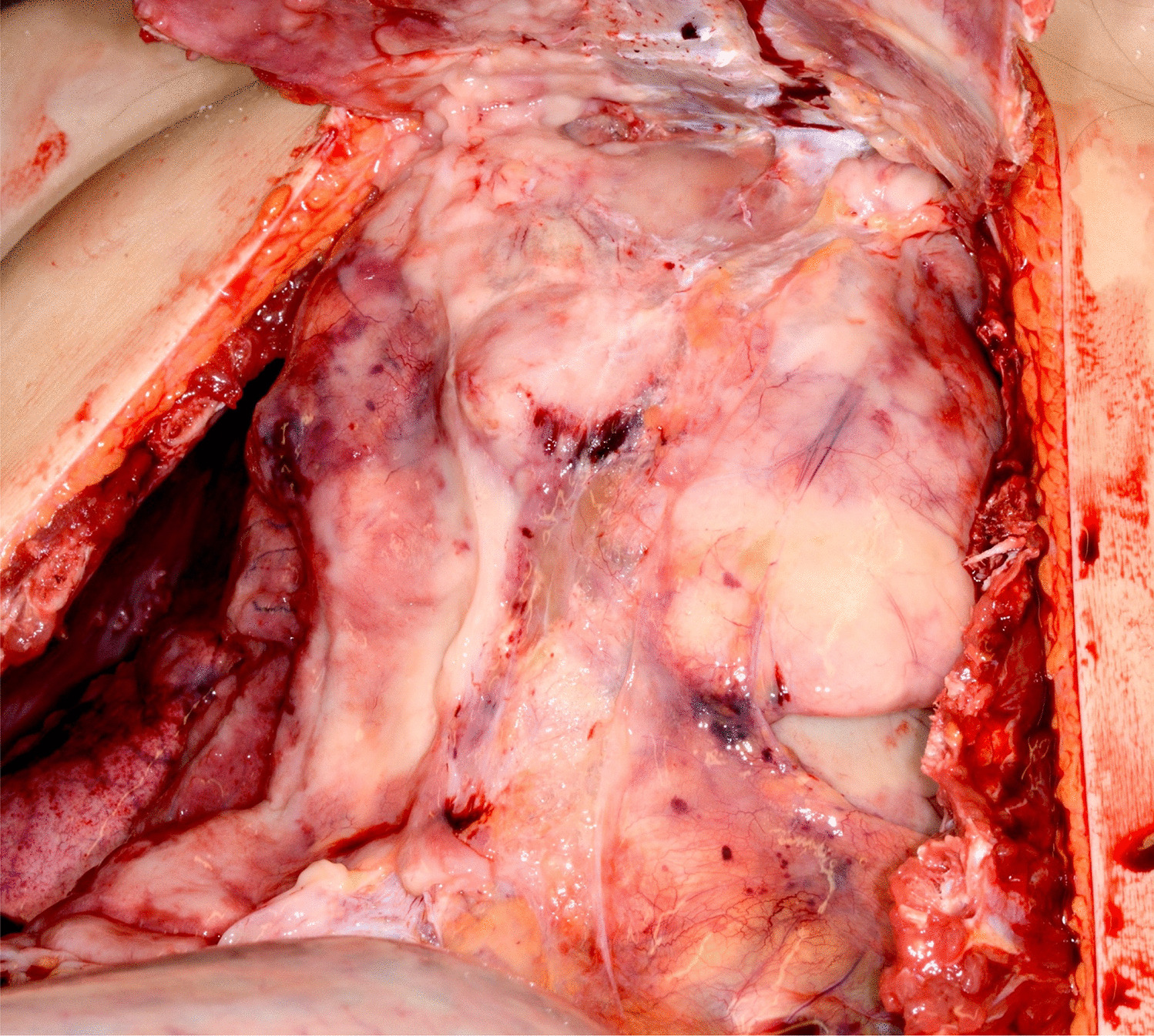 After opening the thoracic cavity, a large tumor mass occupying almost the entire mediastinal space was found. It surrounded all organs of the mediastinum and was palpable up to the posterior part of the thoracic cavity (Fig. 1). In the posterior thoracic cavities, especially on the right side, infiltrations of presumably neoplastic tissue were seen in the course of the intercostal spaces. On the right side of the anterior chest wall, there was yellow-brownish, creamy softened tissue. Regular muscle tissue was no longer delineated here. In this respect, it could be assumed that the tumor had originated on the right thoracic wall. The tumor encased the trachea, the esophagus, the aorta and the carotid arteries, with subsequent compression of these structures (Fig. 2).