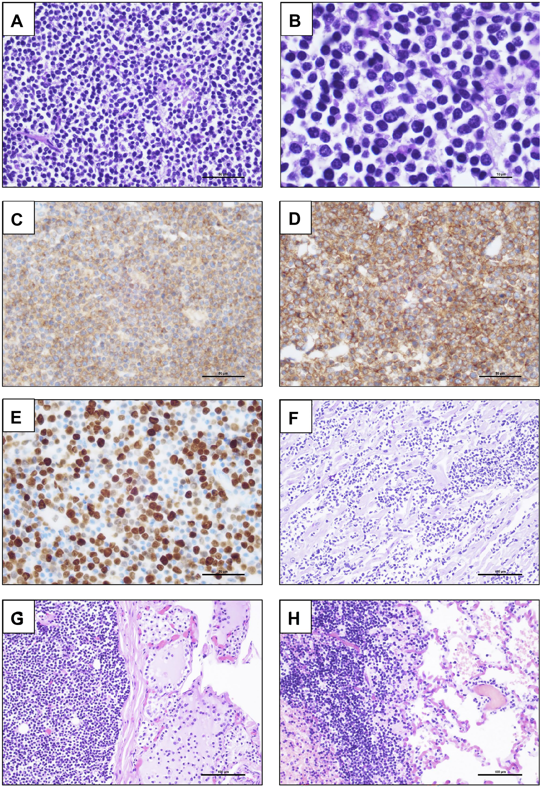 Histomorphological investigation of the mediastinal tumor revealed a neoplasm showing a solid growth pattern and consisting of small round tumor cells with hyperchromatic and prominent nuclei and narrow cytoplasm (see Fig. 5A and B). The consecutive histomorphological analysis of the organs revealed a diffuse infiltration of the heart (F), thyroid gland (G) and the lung (H) by this small blue round neoplasm as shown in Fig. 5.
