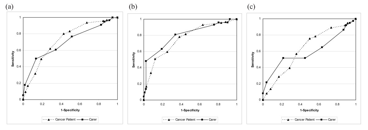 Descriptive analyses included frequencies, percentages, means and standard deviations, medians and interquartile ranges (IQR) for skewed data, to describe the characteristics of the study sample (socio-demographics and cancer information), anxiety and depression (HADS), distress (DT and PL) and triage (level of care). Receiver operating characteristic (ROC) analysis was used to evaluate the diagnostic accuracy of the DT to detect cases identified by the HADS. A series of ROC curves were created using the different DT cut-off scores on the clinical cut-off score of the HADS-T (≥ 15) and HADS-A and HADS-D (≥ 8) in order to measure the sensitivity and specificity values in discriminating cases as identified with the HADS. Differences between cancer patients and carers for demographics, cancer information, anxiety, depression and distress were analysed with t-tests, Mann-Whitney U-tests and chi-square analyses. The associations between participant characteristics and DT, DT and HADS, Problem List and level of care were assessed using chi-square analyses. Participant characteristics significantly associated with distress (p < 0.05) were entered into a multivariate logistic regression model to assess relative contributions. Quantitative data were analysed using the 'Statistical Package for Social Sciences' (SPSS) 14.0 for Windows.